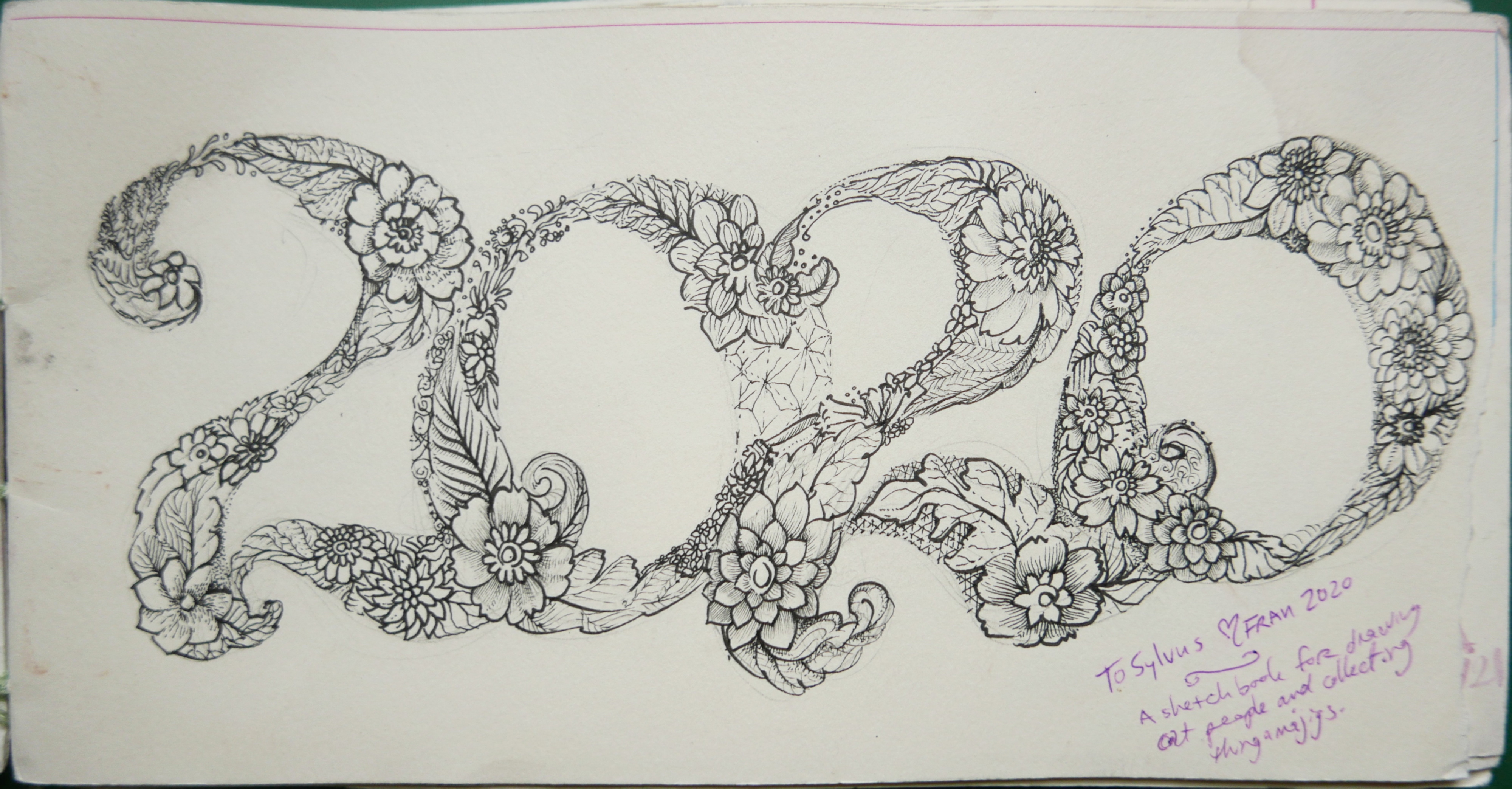 Handmade journal, first page, with inscription and “2020”[1] in floral doodles on 5x10 inches, paper, ballpoint and micron inks, 2020. Lumix LX100 f/1.7, ev +0.7, 1/125s, ISO 200, WB: cloudy; lightened, transformed, cropped, scaled in gimp.