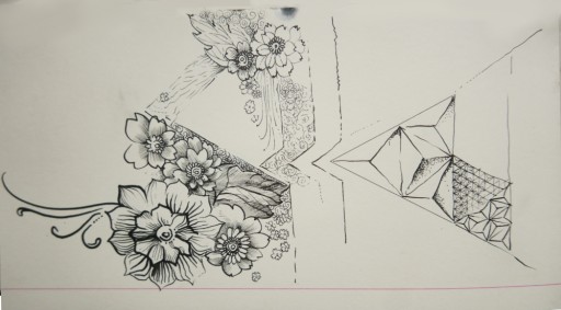 Handmade journal, final sheet, 5x10 inches, paper, & micron inks, worked on periodically & finally “completed” dec312022. The triangular motif comes out of a registration mark printed on the paper & worked into the design. Lumix LX100 f/1.7, ev +0.7, 1/125s, ISO 200, WB: cloudy; lightened, transformed, cropped, scaled in gimp.
