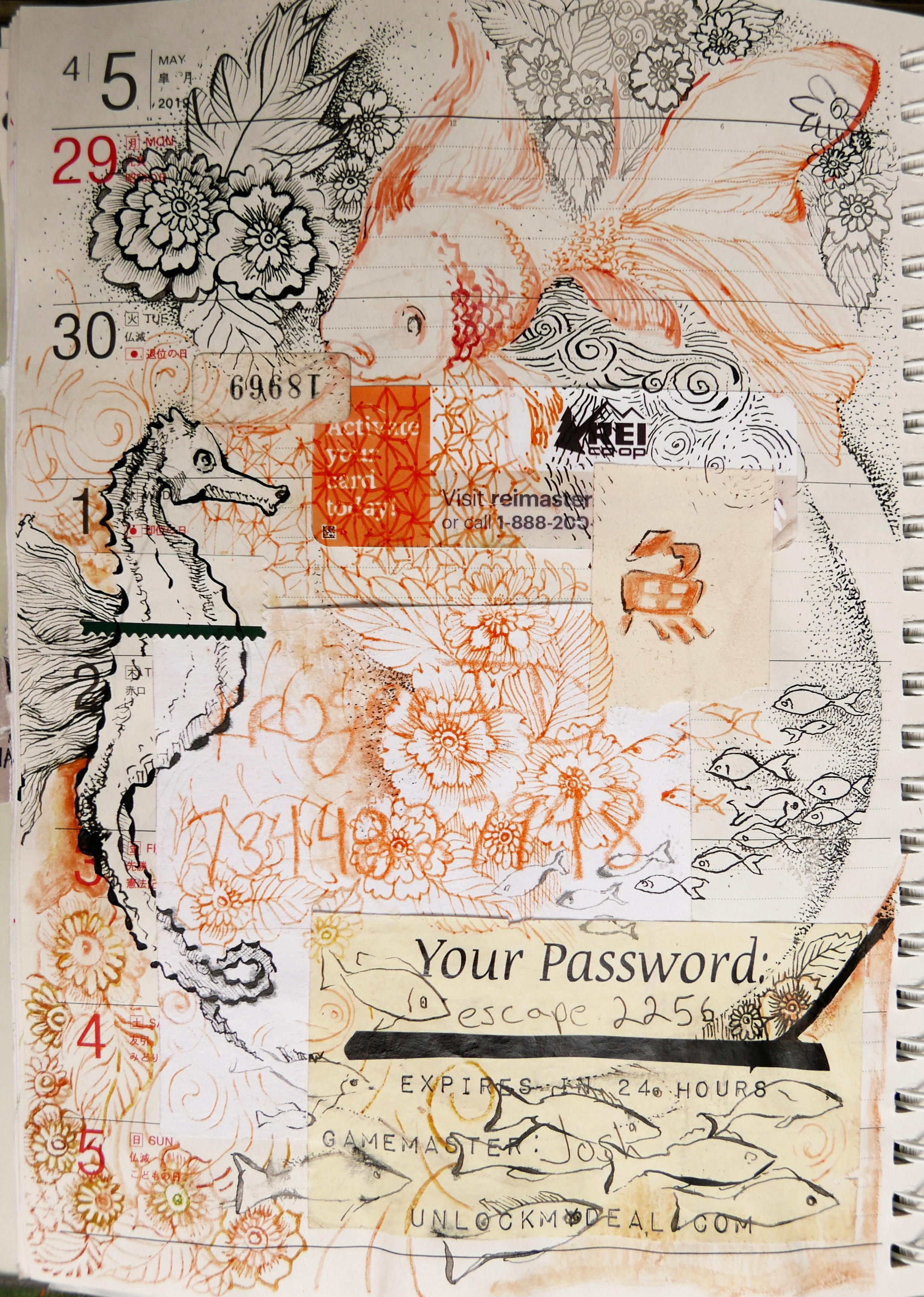 pen and ink, coloured markers, coloured pencil, watercolours, stickers and found papers adhered on a 2019 Japanese appointment diary, 8.25x5.5"; photographed panasonic lumix LX100, unified transform, crop and levels tools applied.