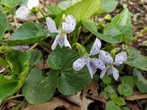The first violet ref shots I found in my files were dated around 6apr—but there are at least four species blooming in my yard (that I think of as ‘pale reddish purple, ivory, common, southern white: the latter two interbreed pretty freely, and are the aliens most people picture when they think of violets) and I do have photos, such as the one below, taken in early May. The very fun Freckles cultivar, which I once tried unsuccessfully to grow from seed, actually belongs to a neighbor a few blocks away, and has naturalized (and interbred, to make a less spotted version) to the point of growing in their driveway cracks;) I was so pleased to be able to take my very own pictures of this unusual type. Unfortunately, in a lot of them the foregrounded flower is distractingly out of focus.