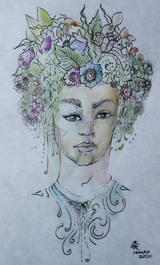 I have been doing these flower-hair fantasies for, unnh 2020-1984, um, about 35 years now.[1] And I still tend to draw the eye on the right higher than the left, an error I've been making as long as I've been drawing portraits. You'd think I'd’ve learned to correct it by now. The fairy, or princess, or lady, is literally one of colour (I've been putting magenta and purple into my portraits since, again, at least the early 80s) but I wanted to do a black person because these sorts of things so often only show white ladies.[2]