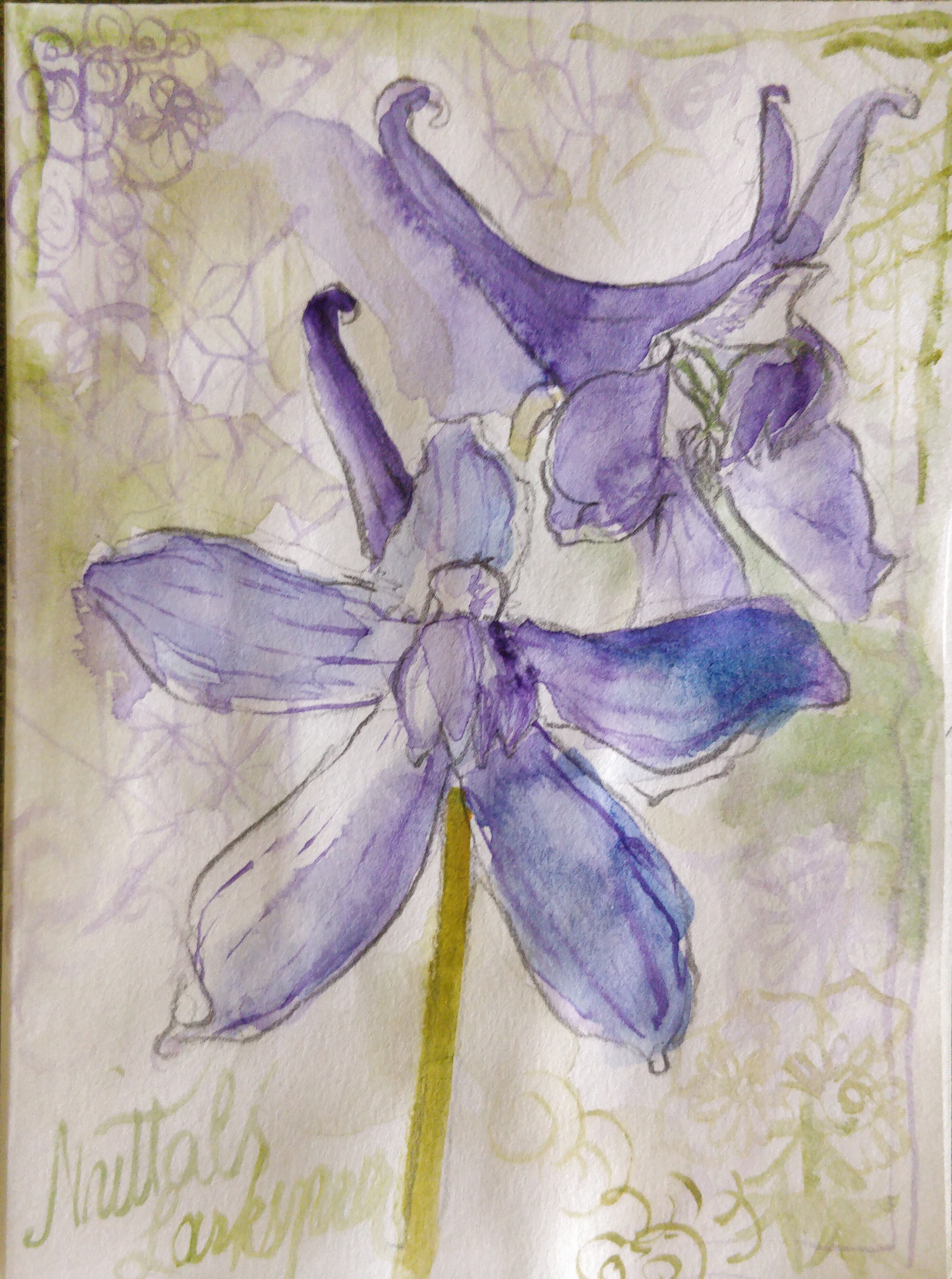 This notecard was originally I planned as a bouquet of the sort of flowers native to the recipient's region. I like drawing flowers, and the recipient enjoys hiking and seeing them. Unfortunately she's having some health issues that prevent much hiking, so this was to be a sort of substitute. Blue flowers are rare in the wild, and I myself am very fond of delphiniums, so I started with this one—which proved to be so complex that I only drew these two blooms.