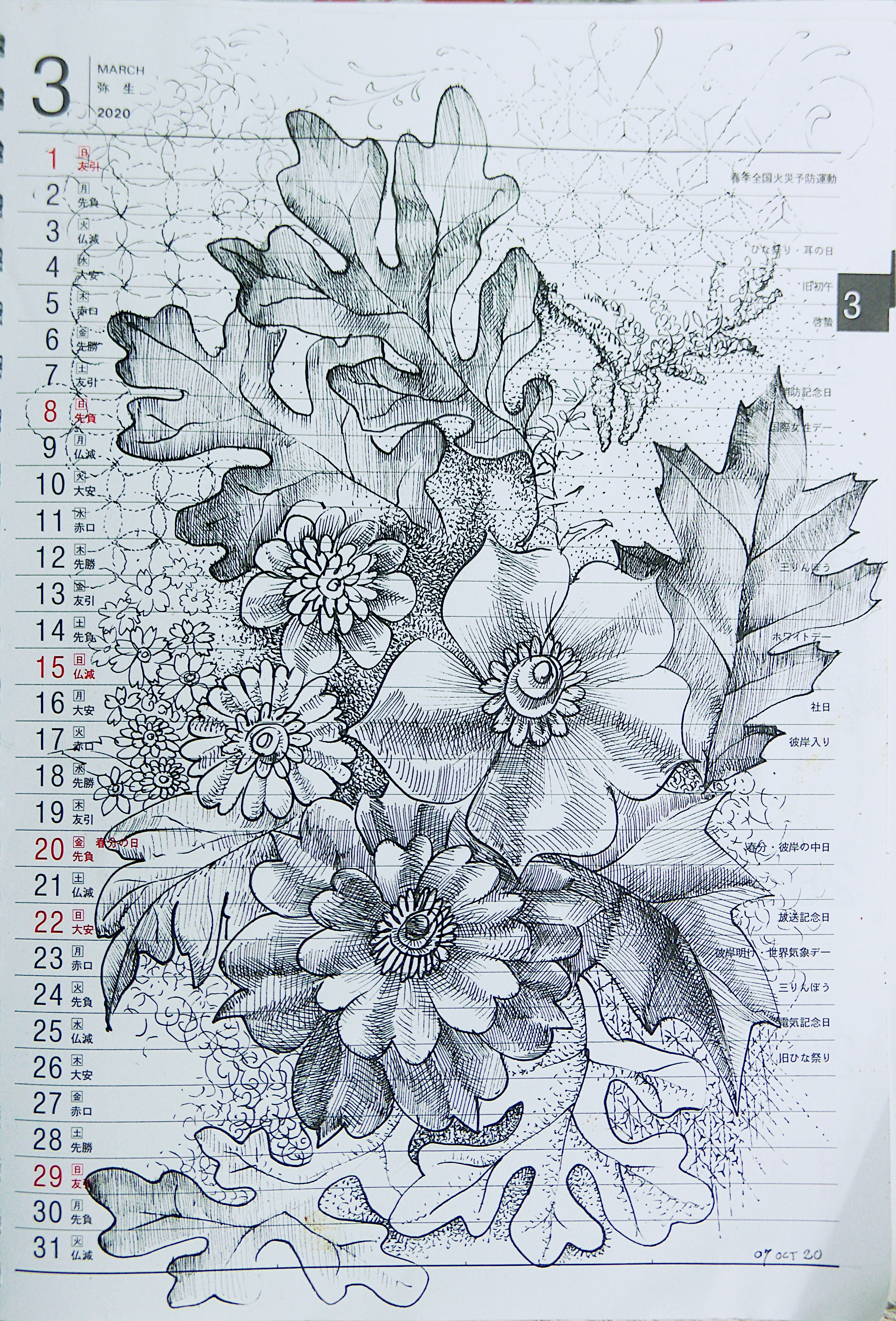 microns on a Japanese appointment diary. Completed 07oct20, microns on paper, approximately 8.25 x 5.5" 1/200 sec, f2.3 +1.0 ev Lumix LX100 07Oct20. Sharpening, transform, cropping, and colour adjustment in gimp applied.