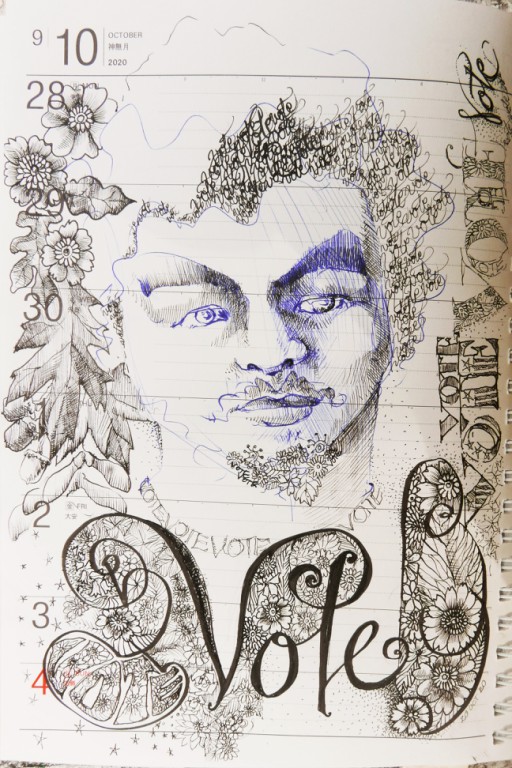 Latest–just completed this morning![1] in a series of floral crosshatched doodles that include calligraphic text urging my fellow USians to vote in our November 3rd election. I don't precisely recall who was the inspiration for the portrait, but it's not a likeness—I enjoyed doing the heavy brows from some of my earlier portraits, but this gentleman, I'm pretty sure, was Latinex, not Asian.