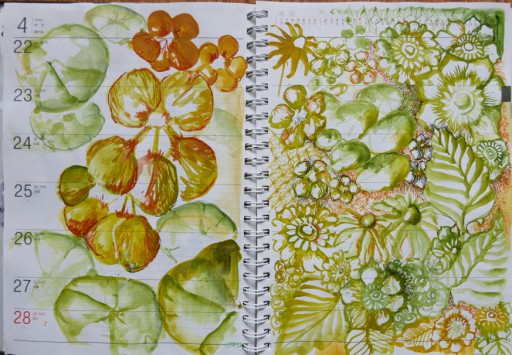Sketchbook. watercolours, technical pens and coloured markers on a Japanese diary, 8.25x11.75". 01Sept2020. Photographed with Lumix LX100, unified transform, crop and levels tools applied.