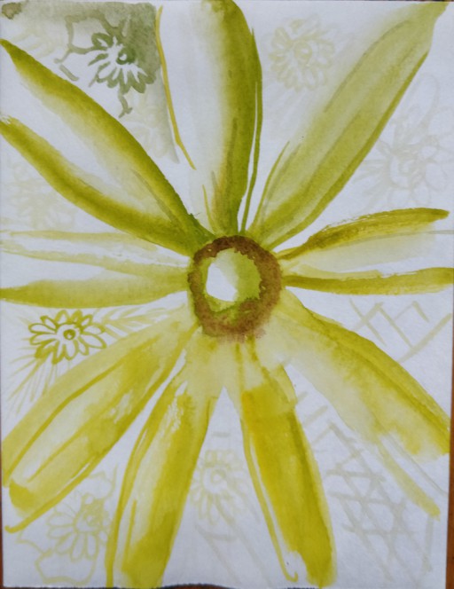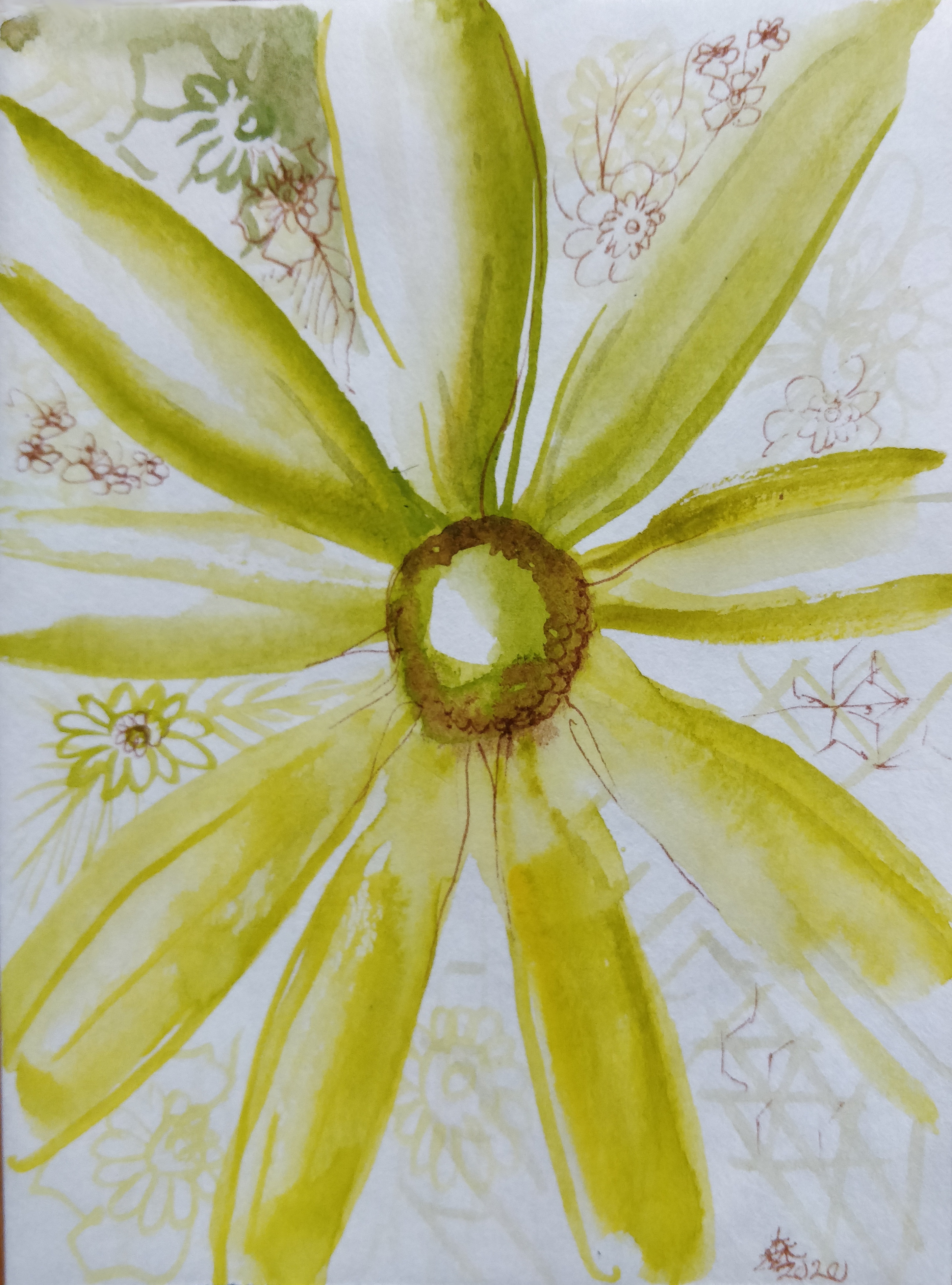 Like the nasturtiums I featured yesterday, these are easy—in fact, even easier—to paint, to the point that, like the black eyed susans (which I will eventually feature, I'm sure) that I can paint a petal in one, twisting motion of the brush, a delightful (and fast) process. However, since the attachment point of the petals was often sloppy in this example, I decided to add a bit of henna inspo decoration, which didn't really help. So then I added a bit more with a brown marker, highlighting the actual florets (the “petals” are called rays, but it's the stuff in the center that is, I believe the actual “flower” part) adding some extra texture to the background.