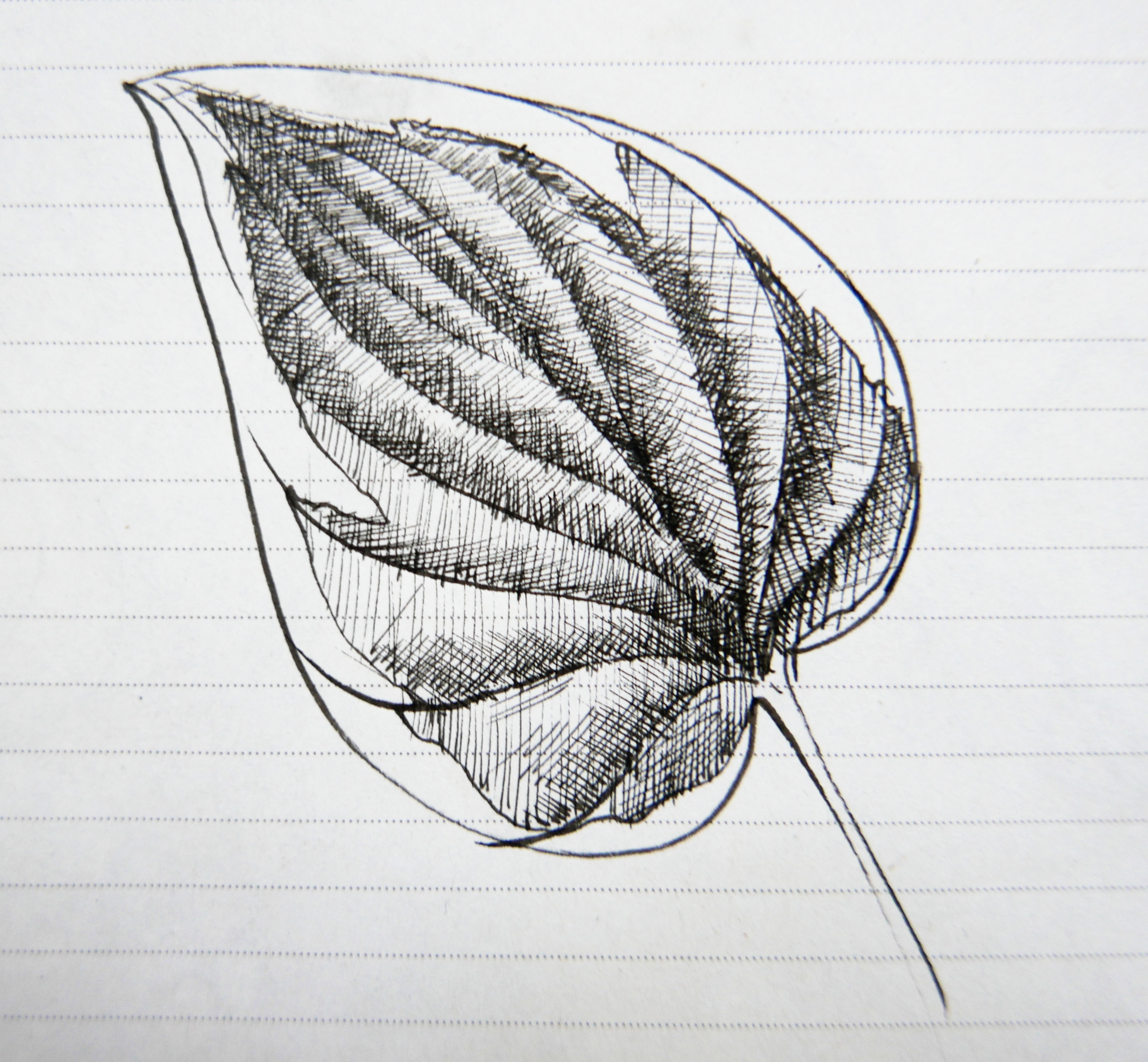 Anyway. I drew doodled sketched this picture of a hosta leaf from memory (no doubt listening to something or other on youtube or the like) roughly during the same period as I was putting together an order for some new hostas to add to my collection, which I placed on the 18th; this sketch was probably made roughly the same time—before the watercolours featured over the last two days, at any rate.