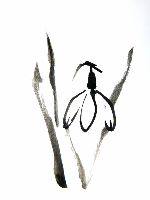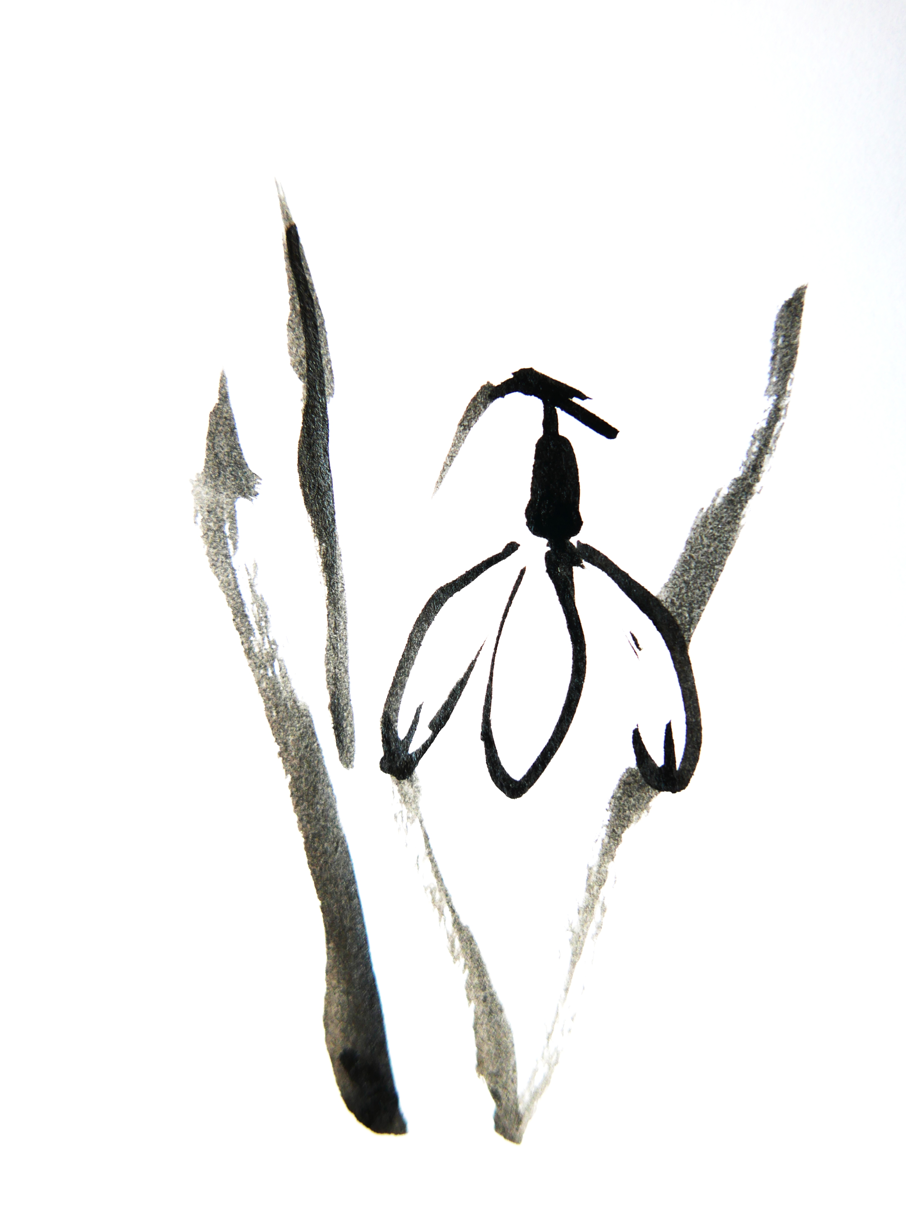 I was very frustrated with the somewhat crappy brush I selected: I have (somewhere) a really nice windsor and newton #4 series 7 sable, but ink is hard on brushes, so I bailed on the good tool and was frustrated thereby by the lack of a truly calligraphic line as a result. However, out of several efforts this one's not too bad; and I do love looking at snowdrops, which painting them certainly gives me the opportunity to do.