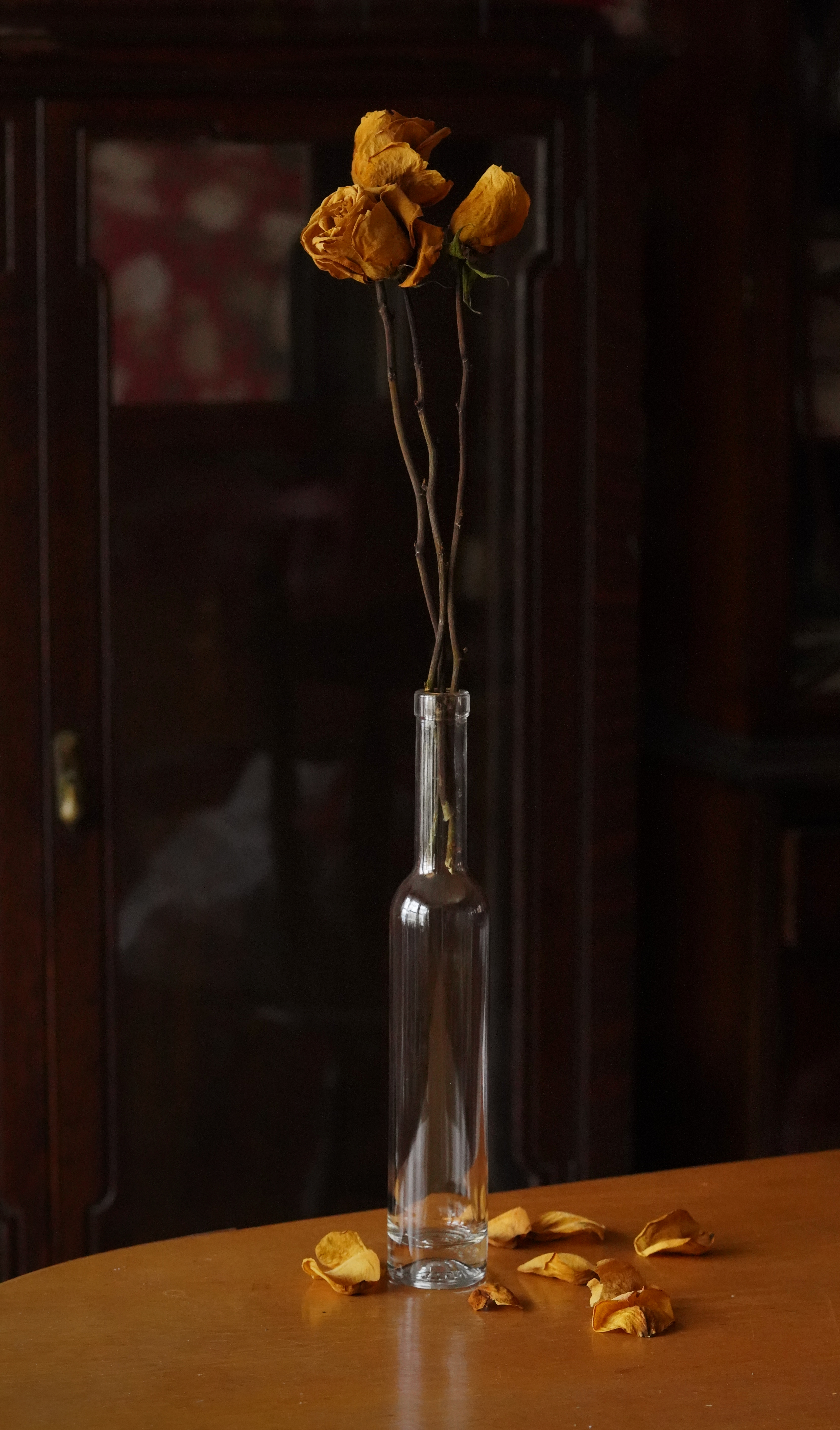 My dear friend Page gave me these dried yellow roses, which clearly had some emotional resonance, and just as clearly, needed to be decluttered out of her life. (She could compete with Marie Kondo for clearing out crap. I on the other hand have to work hard to not to approach kitty-house hoarder tendancies. We make for a good team;)