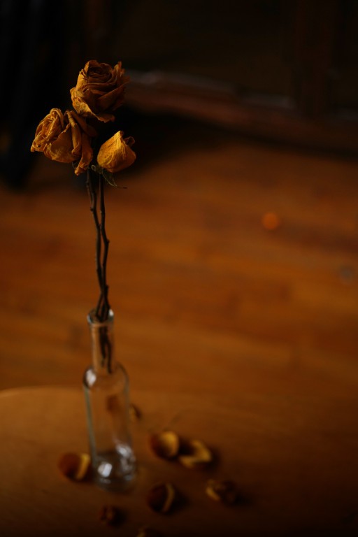 Since the petals were falling off even before I got the roses home, and—much as I love dried flowers (and leaves and acorns and whatnot) that I think I will paint beautifully detailed watercolours of, what actually happens is they sit around collecting dust till Autumn (or even Winter) rolls around again and I've done nothing, so out they go—and these weren't even mine!