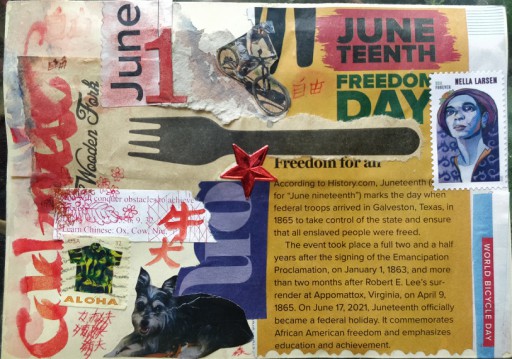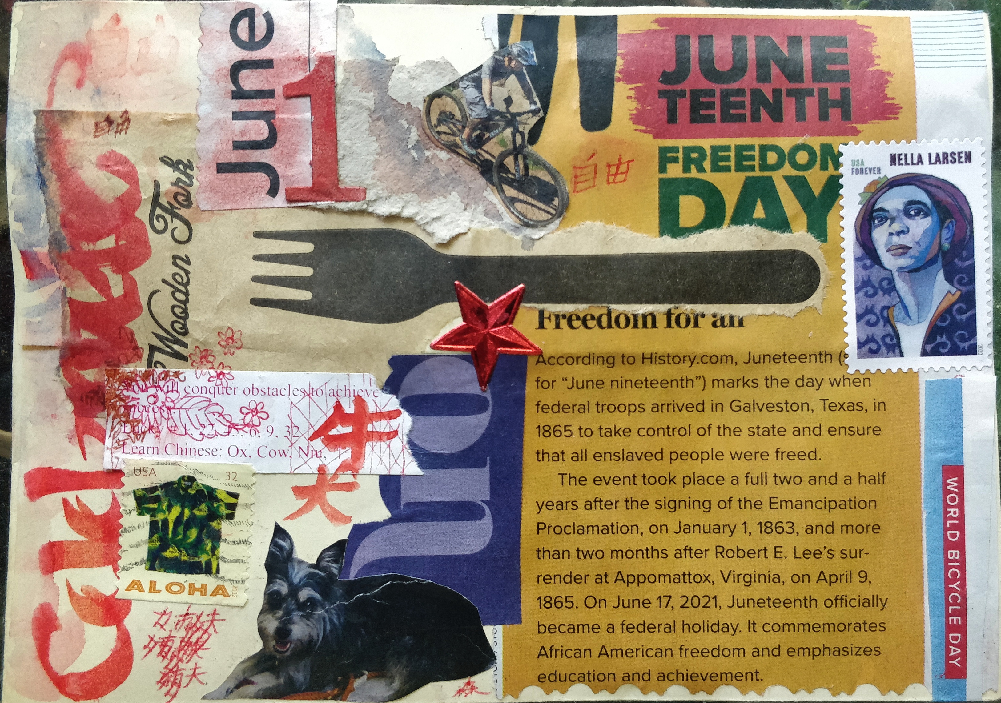 Expanding from the personal liberation (the first) the national—Juneteenth (the 19th), to the world (Bicycle Day) on the third—the card references all three with varying levels of specificity. Most of the ephemera comes from the mostly-useless costco mag they mail out, but it had some legs on the cover this time, and Fran collects legs (though usually floppy, photoshopped limbs, as opposed to extremely muscular ones of ultra-marathoners) so I just kept clipping stuff from it: that's where the references for both Juneteenth & world Bike day come from (both the recipient and I are cyclists, and hope to do trips together, so this seemed very appropos.)