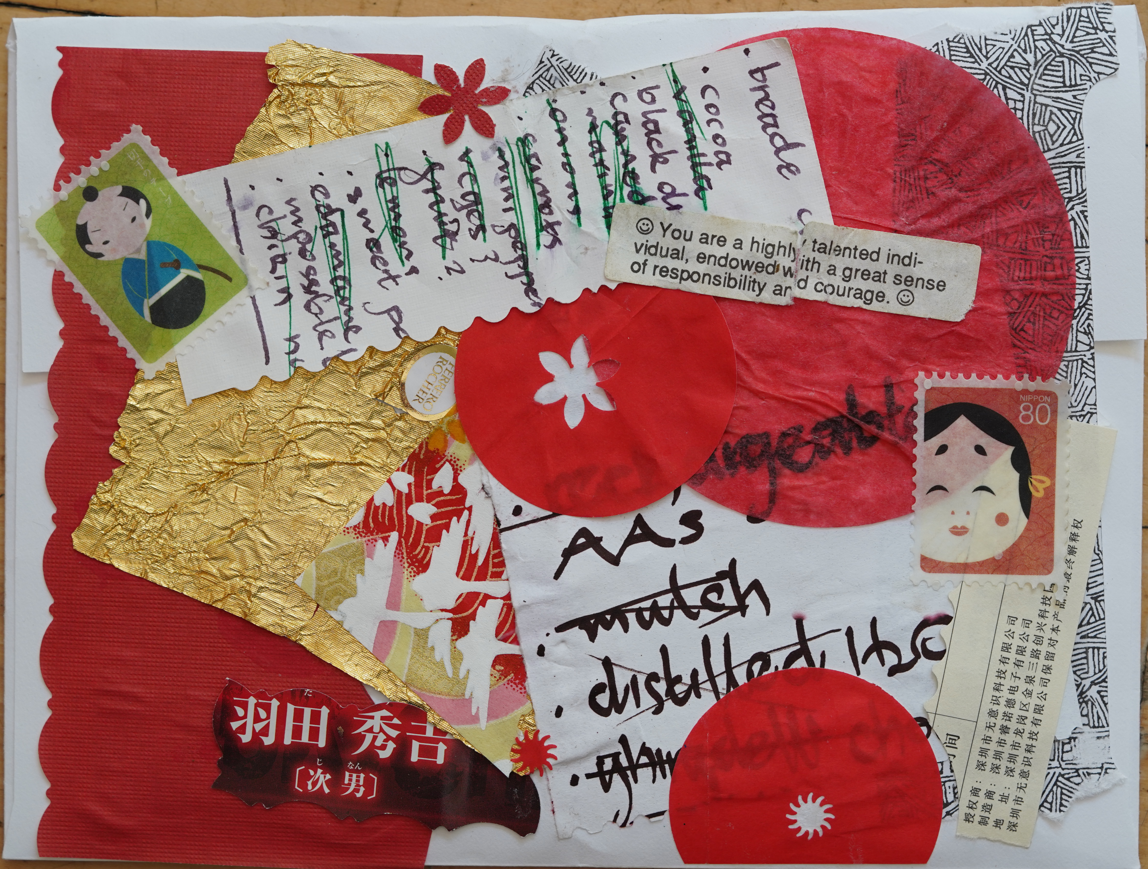 Envelope back for a letter: calligraphed grocery lists, fortune, washi tape faux stamps, origami paper, chocolate foil, privacy envelope patterned[1] paper, a bit of advertisment from a Case-Closed film; paper punched and glued. Sony ILCE-7C, sony 90mm macro lens, f/4.5, ev +0.7, 1/100s, ISO 400, natural light; cropped and scaled.