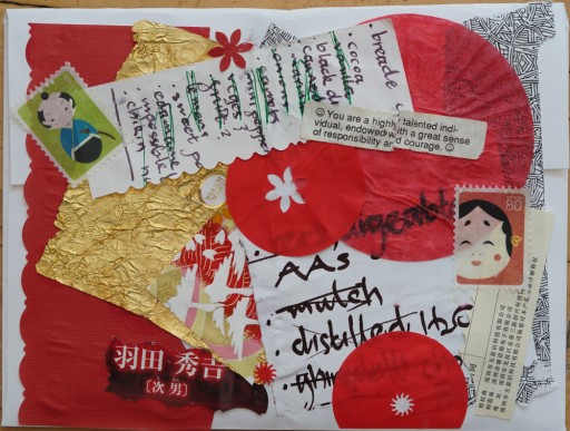 In any event, rather than preserving it because it was “too good to use” I put some of it in this piece for the fabulous Fran, whom I felt entirely deserved the fortune pasted here. I had no idea what to do with a ‘Case Closed’ poster, so reserved the one tiny piece of red outlined text (lower left edge) as well as sticking in two sizes of every-day calligraphy[2] one of which has a bit of green for snap (along with the blue and green in the washi tape.)