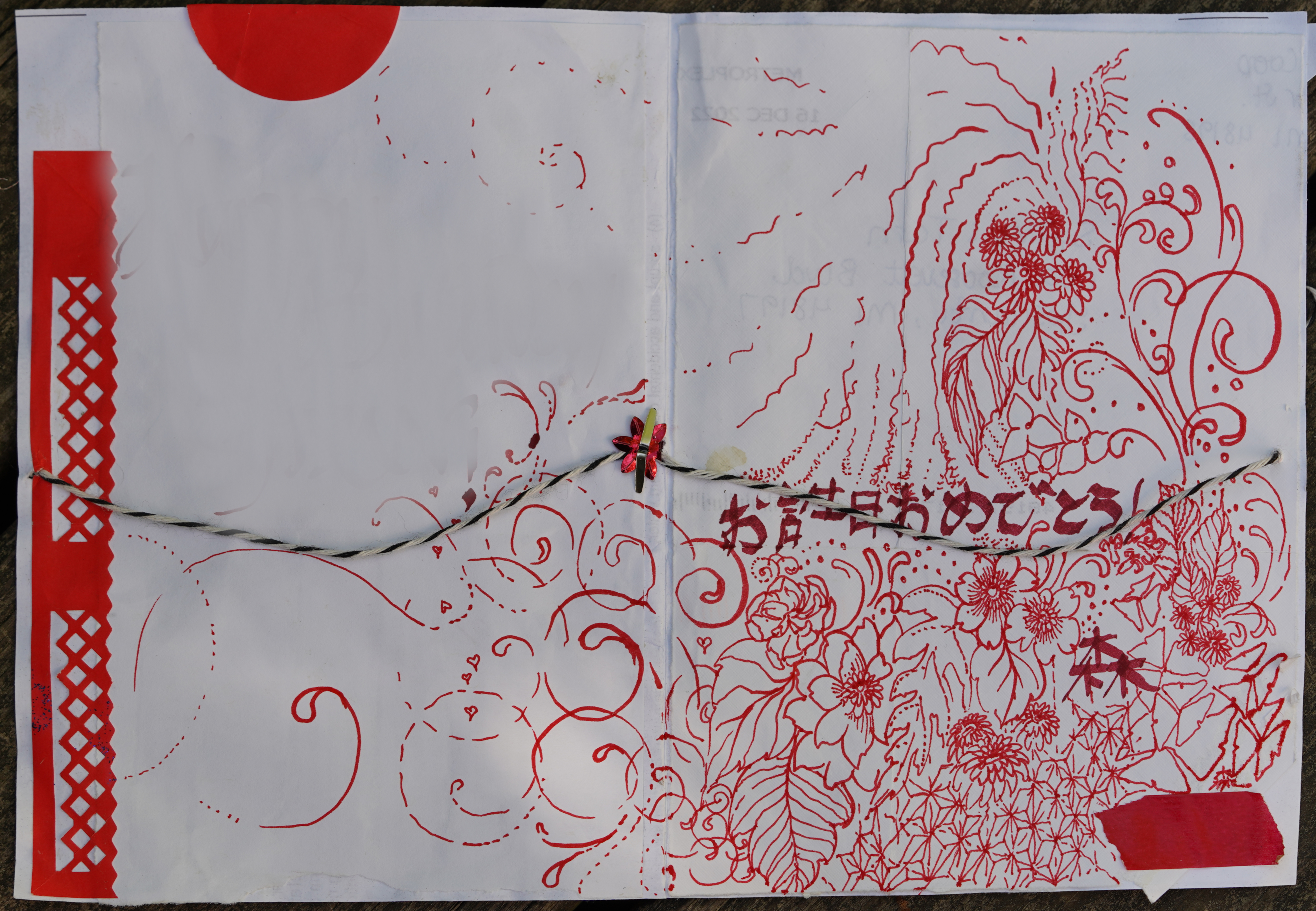 Notecard, vintage photo, Japanese calligraphy (& wrapping paper), sudoku puzzle, washi tape, tea bag tag, other ephemera; 2023; sony ILCE-7C with 90mm macro, f/4.5, ev +0.3, 1/125s, ISO 100, natural light; Transform, crop & scale tools applied in gimp