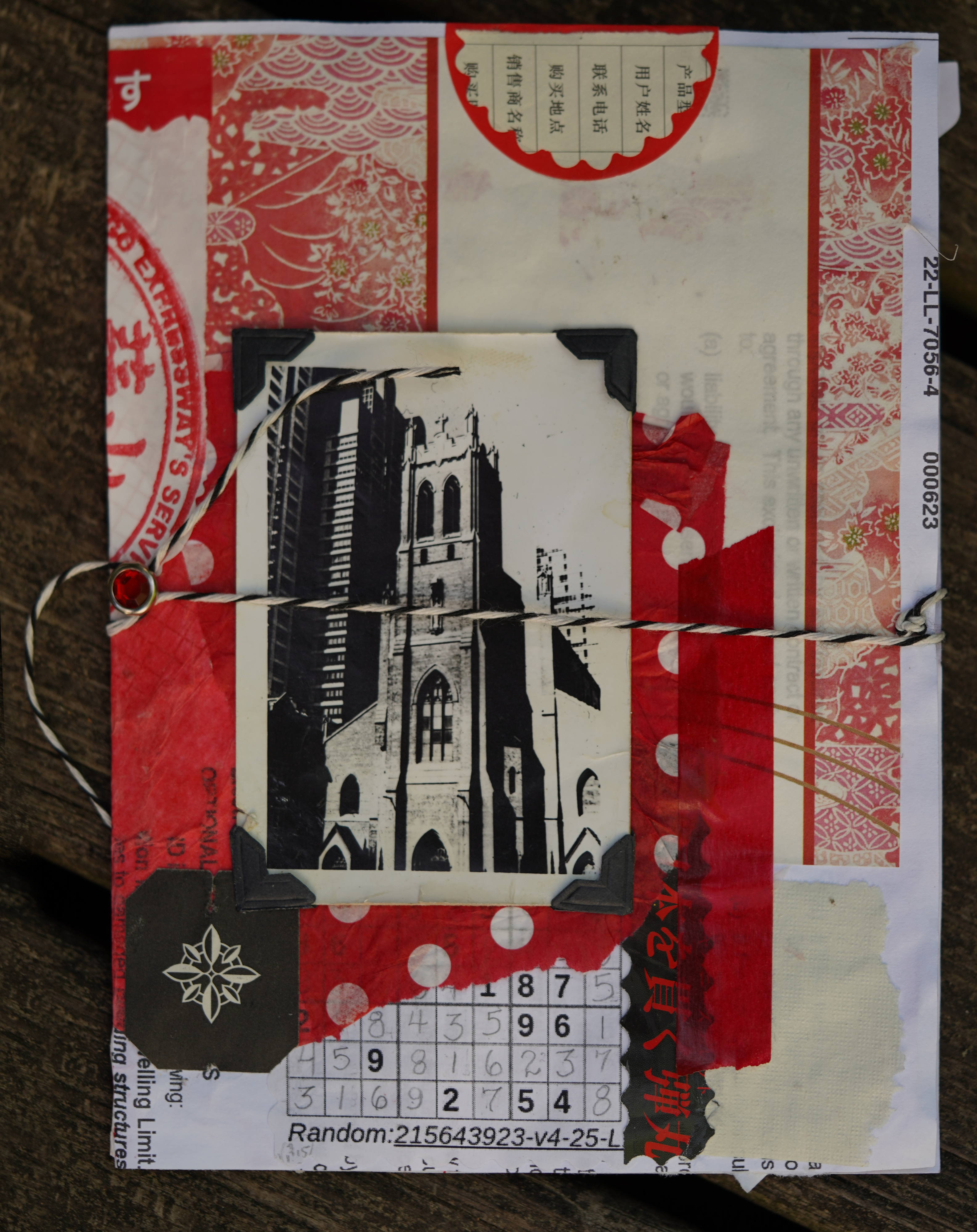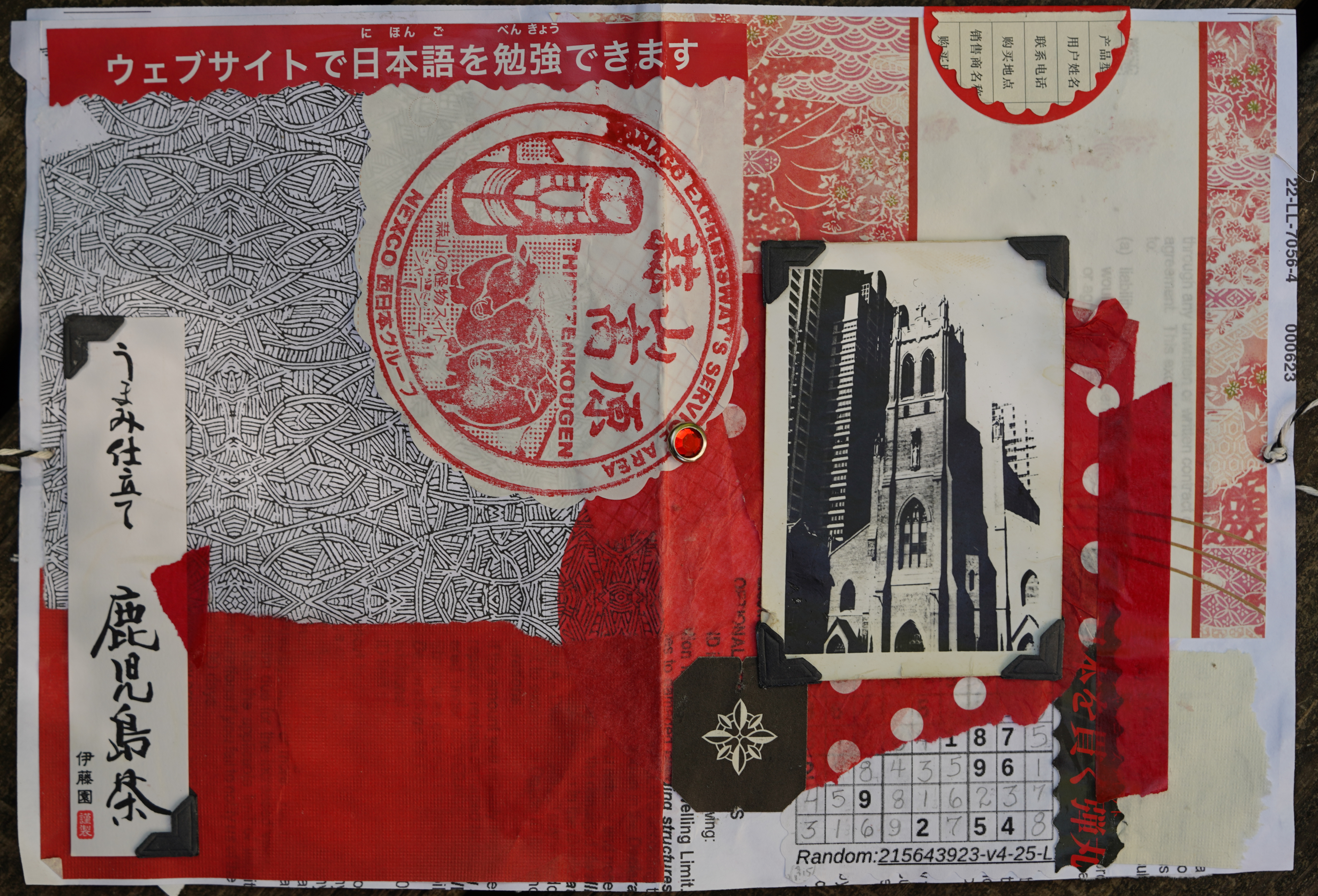 The jewelled red brad, vintage style black photo corners, and red plastic scotch-brand (i.e. USA made) “washi” tape was from my scrapbooking de-stashing friend; the Japanese ephemera—wrapping paper for omiyage, bits of Japanese text, the stamp from the service area—are from f2tY[1] and the vintage black and white photo was probably taken by my friend Page's dad decades ago.