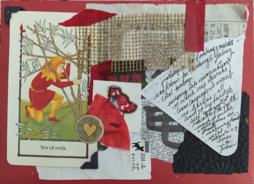 tarot card, mesh, vintage style photo corners, embossed paper, red “washi” tape, Japanese newspaper, Asian horoscope water-soluable tattoo, kanji practise, notes made during youtube video, commercial sticker, bits of case-closed poster; 2023