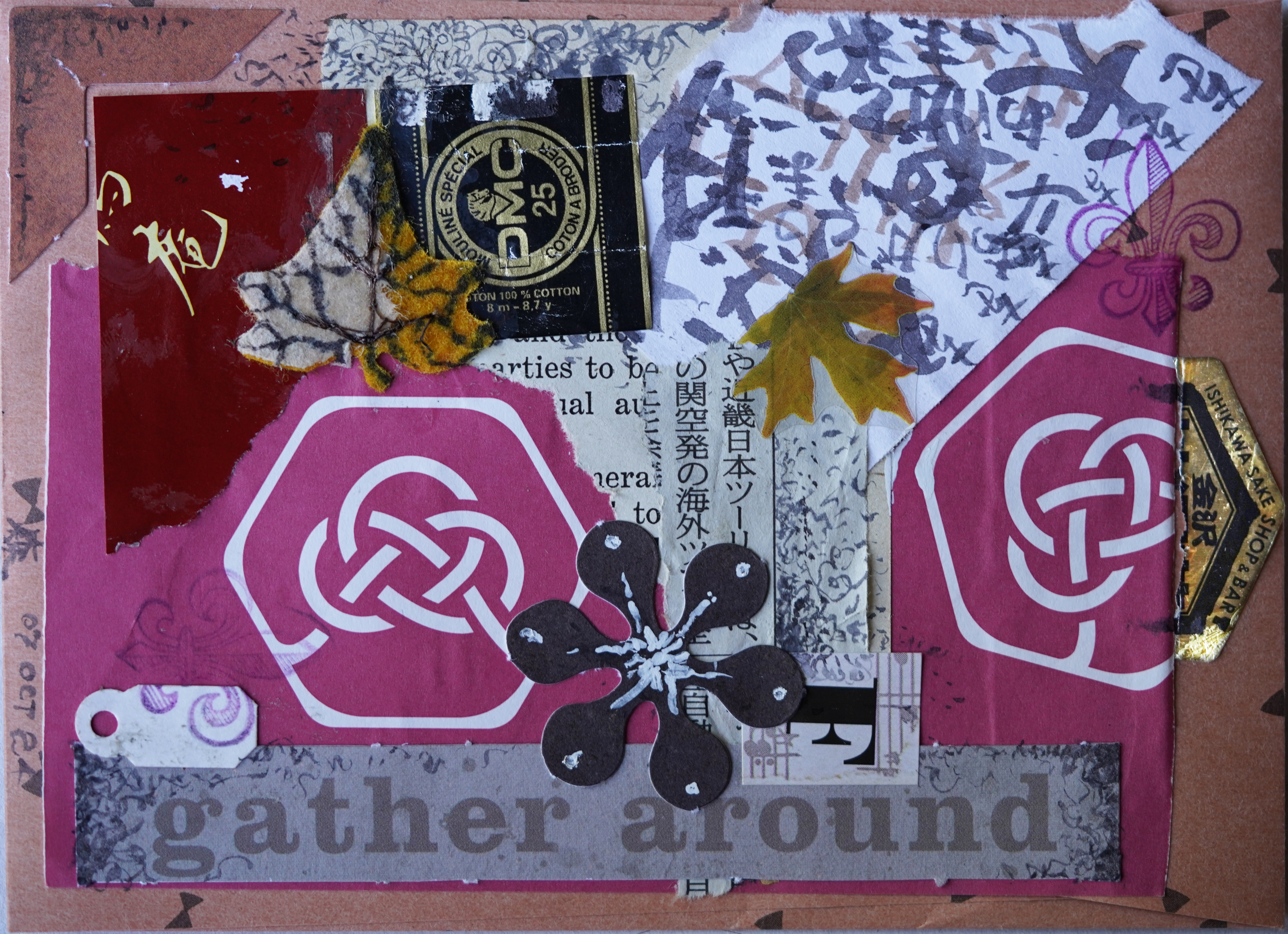 Though it's hard to tell looking at the finished product I started with the printed text; the difficulty was that I liked the interlaced knots in the hexes on the wrapping paper so much I didn't really want to cover them up, which added considerably to my difficulties creating a unified design. I also decided I wanted to use some of the various scrapbooking supplies a sib gave me, and making them not look too...artificial? inauthentic? too I-bought-this-premade-stuff-at-a-craft-store-instead-of-gathering-ephemera-actually-special-to-me anyway can be rather frustrating. Yet I do like items with transparency, (such as the smaller maple leaf) ones with interesting texture (such as the larger felt maple leaf) or interesting shapes (like the 60s flower) and even the blurb felt appropriate—it was a party after all, and people did tend to congregate in rough circles.