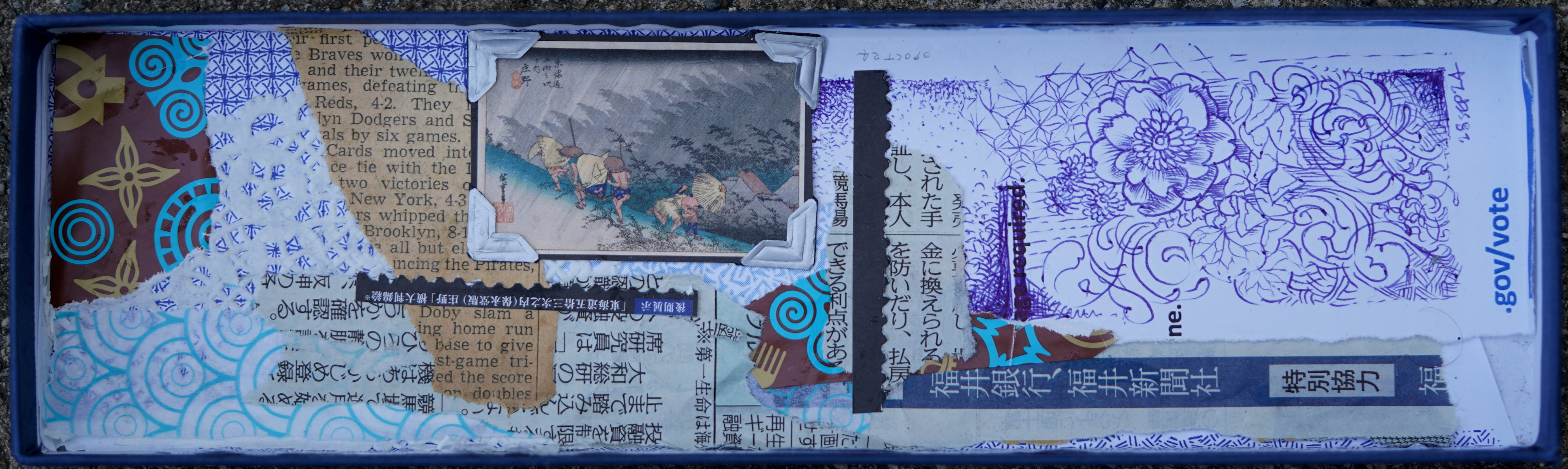 Since the exterior of the box was a very deep blue, to start I selected some privacy-printed envelope interiors printed in blue, as well as a doodle made in blue pen made on an envelope to apply for an absentee ballot. (Vote, people!)