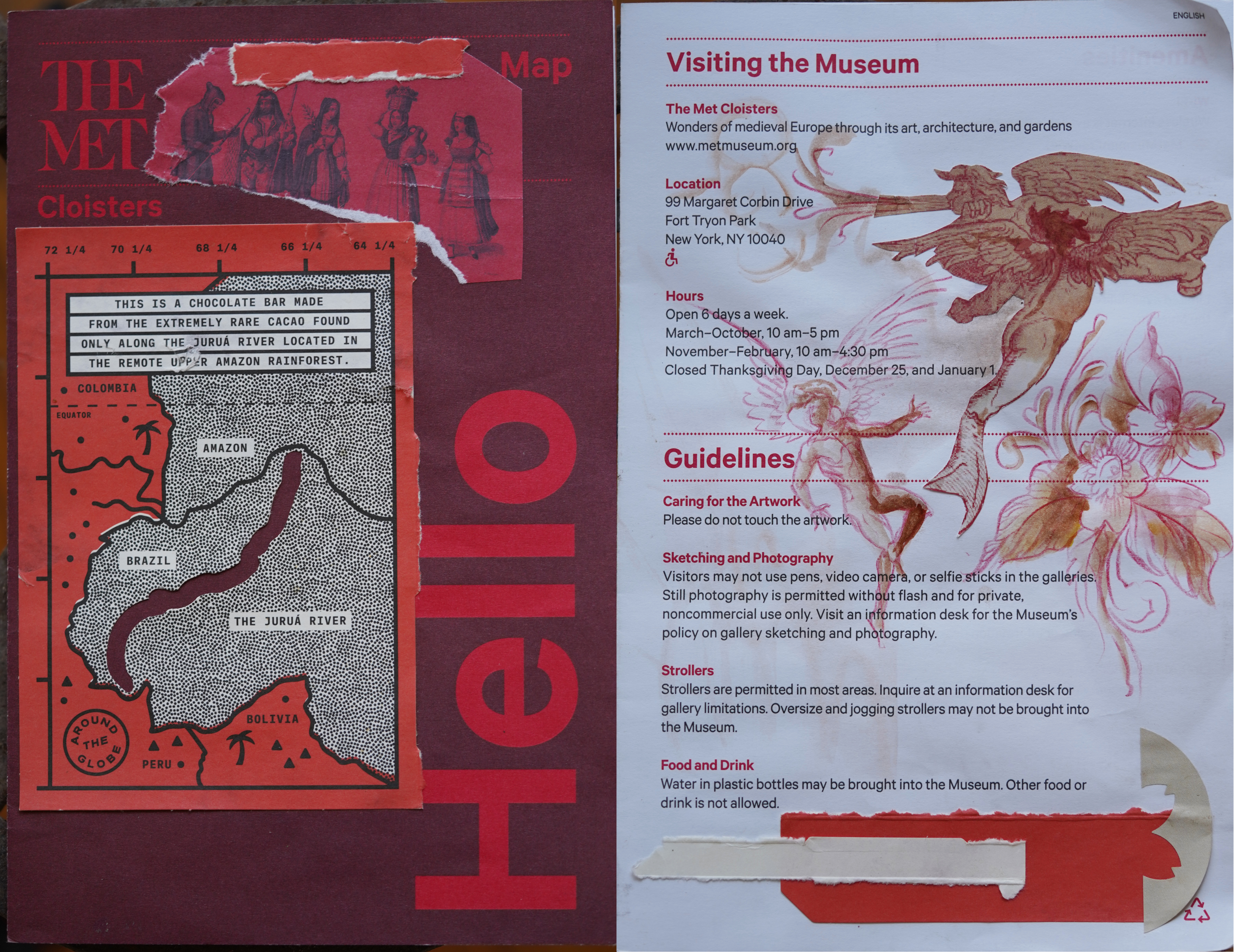 Map of the Met's Cloisters decorated with ephemera, watercolour; each fold, 5.5 x 8.5", front and back shown