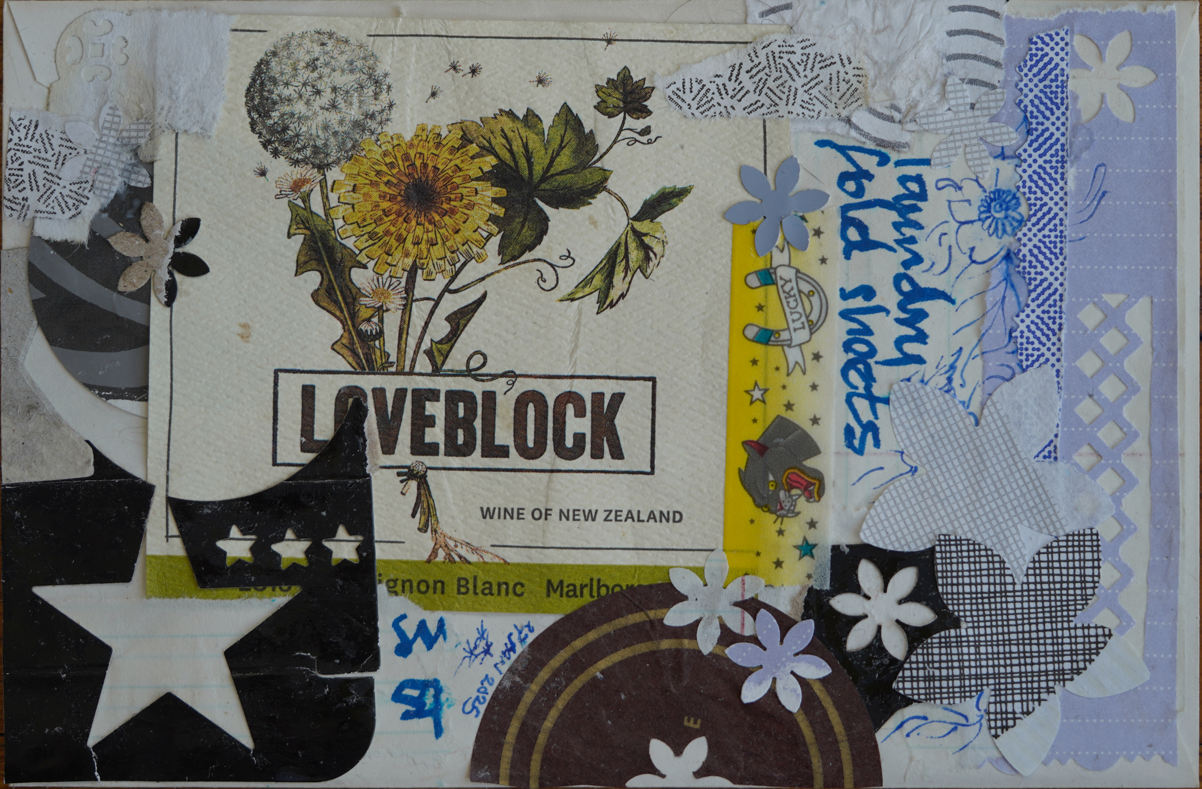 This is the decoration of an envelope back sent to a sibling who likes blue. And I did try to use blue, but I also had this loveblock wine bottle sticker (the sibling will drink wine with dinner, and it was a pretty label) that is more my preferred colour scheme, ivory and sour (yellow) greens. My other goal was to use up assorted stuff lying about so I could clear off the desk(s) to have a clean surface for tax prep.