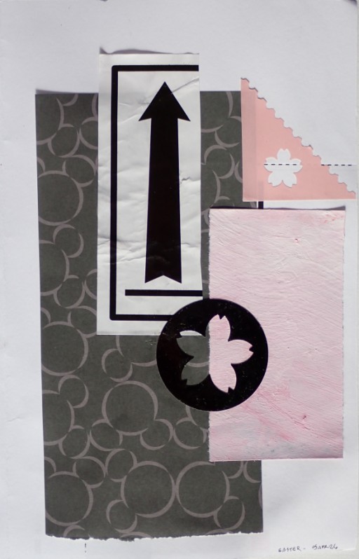 The other rather interesting-to-me component is the red strip with the white crinkles. This was from the envelope, IIRC from the wireless hotspot I ordered for my 2024 trip to Japan, and was the bit that peeled up from opening it. Or something. When I split the paper to remove most of the thickness, the red ink shattered from bending stress, yielding this enticing pattern, which I accented with some red tape from something-or-other and some red and white checkered washi tape. A commercially made embossed business card combined with dekop's embossing sakura punches used on the pink ‘background’ of some dizzy stickers finish things off. (I guess after I finish punching out my own stickers from the available backgrounds, I'll donate themickey & minnie mouse stickers that are the actual product;)