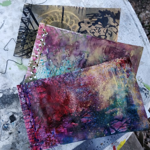 I made three journals for 3 folks who like sketching from scratch pads my sister-in-law no longer needed, adding inserts so memorabilia or similar could be pasted in. One person requested black and gold, one peach and olive with bronze, and I wanted to use some of Frances’ fancy gold tinted red fountain pen ink.