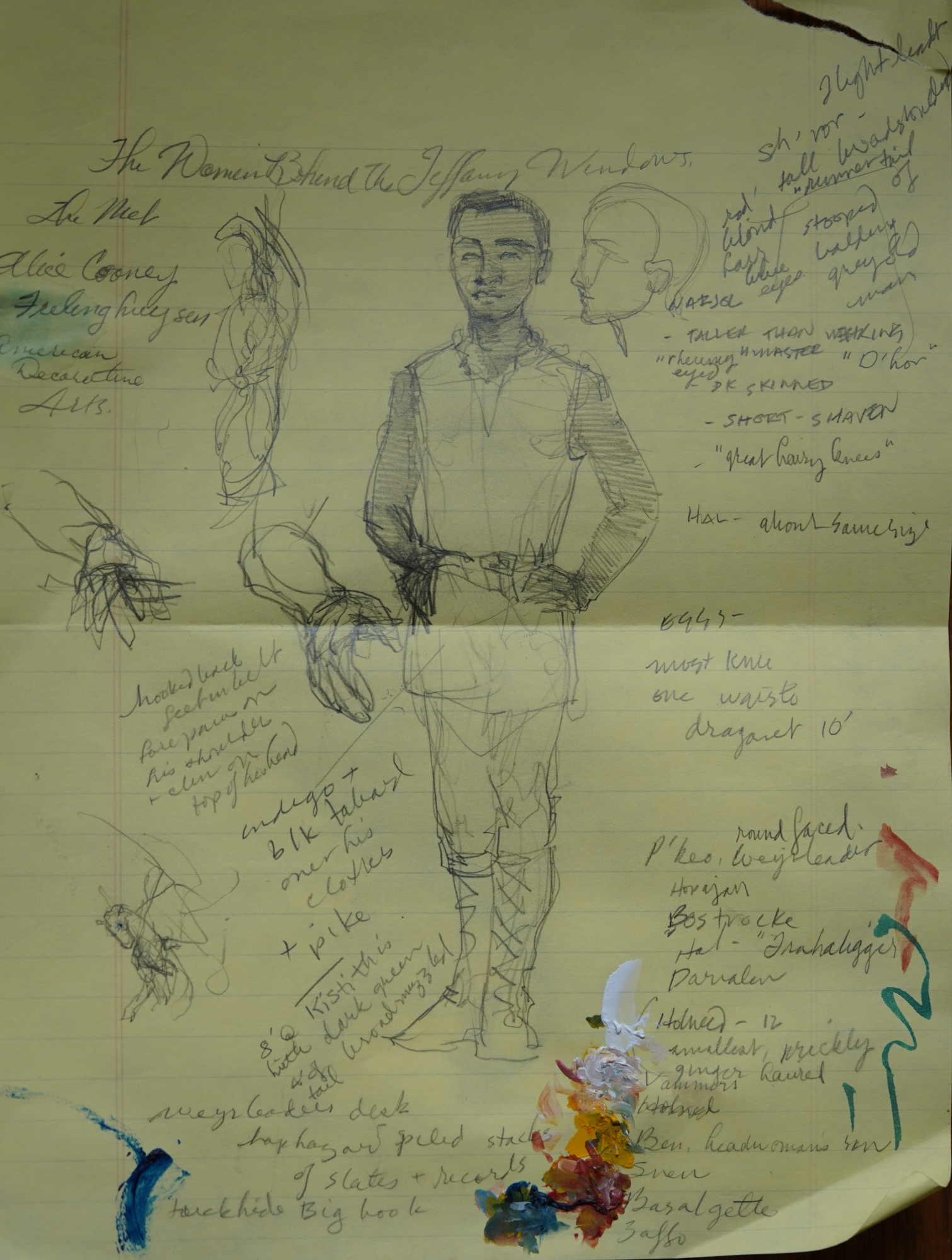 graphite on lined yellow paper, roughly 8.5 x 11", notes for character descriptions & ideas for Jolly. Pixel pro 6. You can also see I used the paper as a palette for the final piece;)