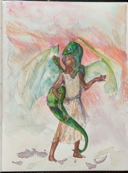 One element I really like in the fanfic is that the dragons come in an assortment of colours—the way they were described in the original series implied each color was very consistent, like, say red squirrels or white-tailed deer: not a lot of variation between individuals. This particular dragon is described as being dark green, but I drew the wings lighter to imply their translucency (not altogether successfully, but I expect if I keep illustrating this series, I'll have lots of opportunities to nail this down.)