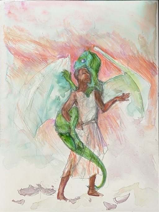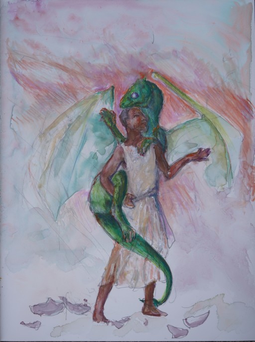 It's likely no better a solution than Whelan's but for the moment, it's my preference, not least because dragons look more like dinosaurs (of which birds are the modern example) more than anything else, so even though bat wings make a lot of sense for a featherless animal, I relied more on bird anatomy for underlying wing structure; after working that out, then I had to figure out what the human character looked like, since all the text says about him is that he's the biggest in his class and he's dark skinned. Oh, and that he has nicely muscled arms. So, slender or stocky? Handsome or plain or somewhere in between? The admiration for his arms comes up in the context of a girl his own age admiring them, so his facial features are probably fairly typical; but is his head round or long or heart-shaped, are his lips thin or full, his nose and mouth wide or narrow, his hair straight, curly or wooly?