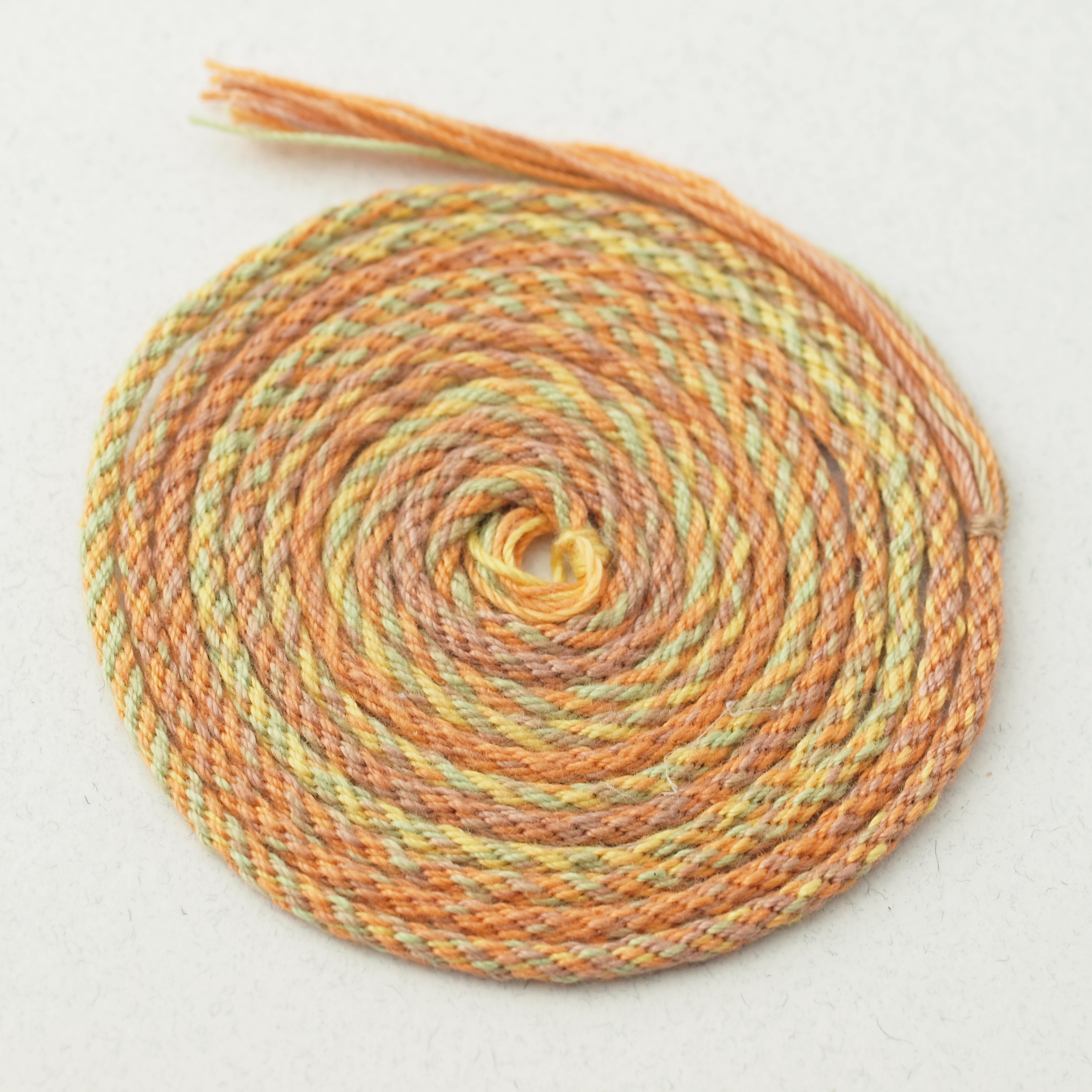 It was braided on one of those foam disks, and so is much more uneven in quality than a marudai loomed braid would be. The pattern is kongo, which is a very natural and easy one to do on a disk. Nevertheless I think the subtle color shifts are nice, if not spectacular.