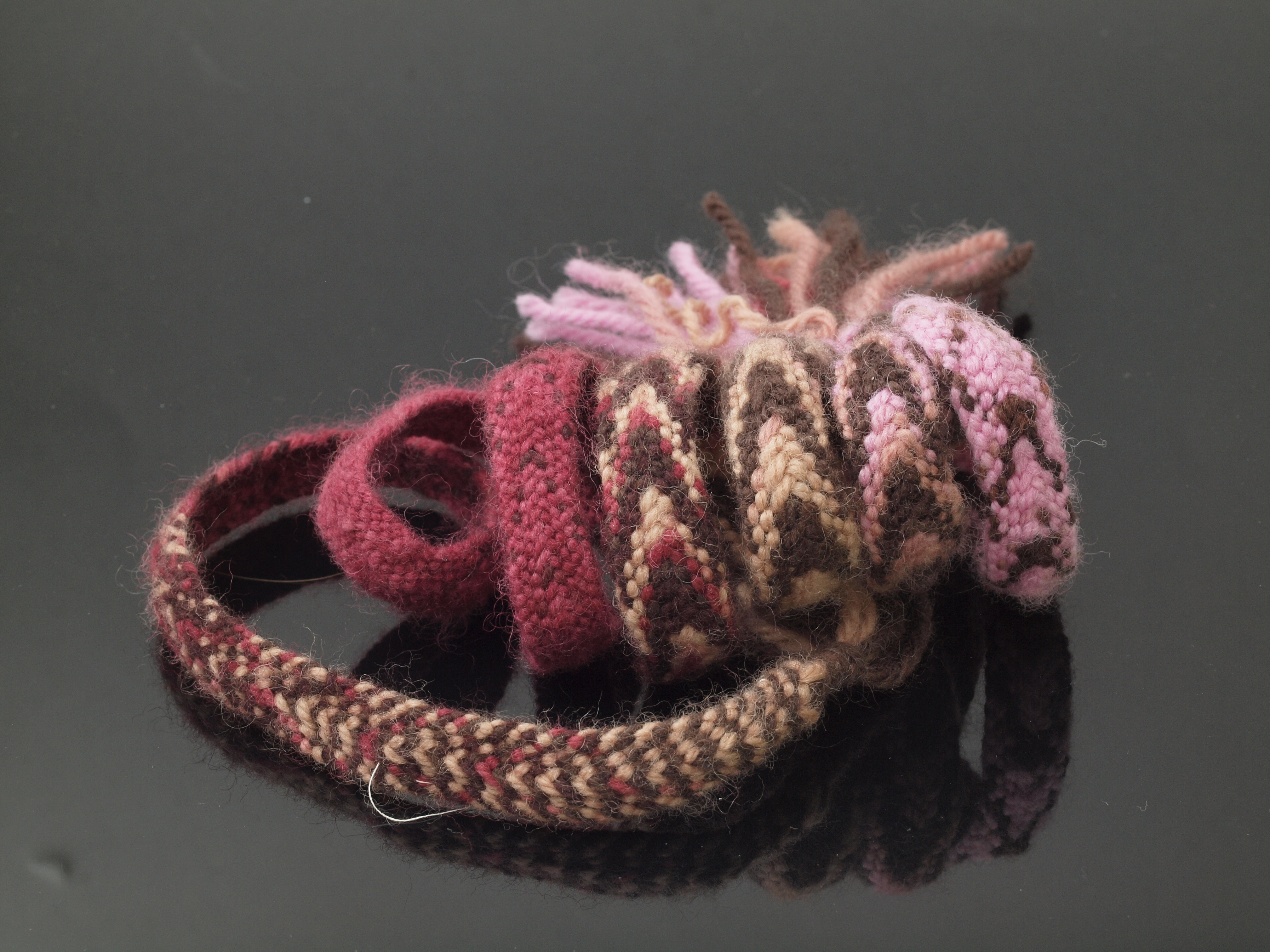 Flat braid, 2015–2016. 3/4inch x approximately 48inches long (including tassels). The desired pattern is on the right, the much shorter ‘speckled’ part is after I got confused. 100% wool, 16 strands.
