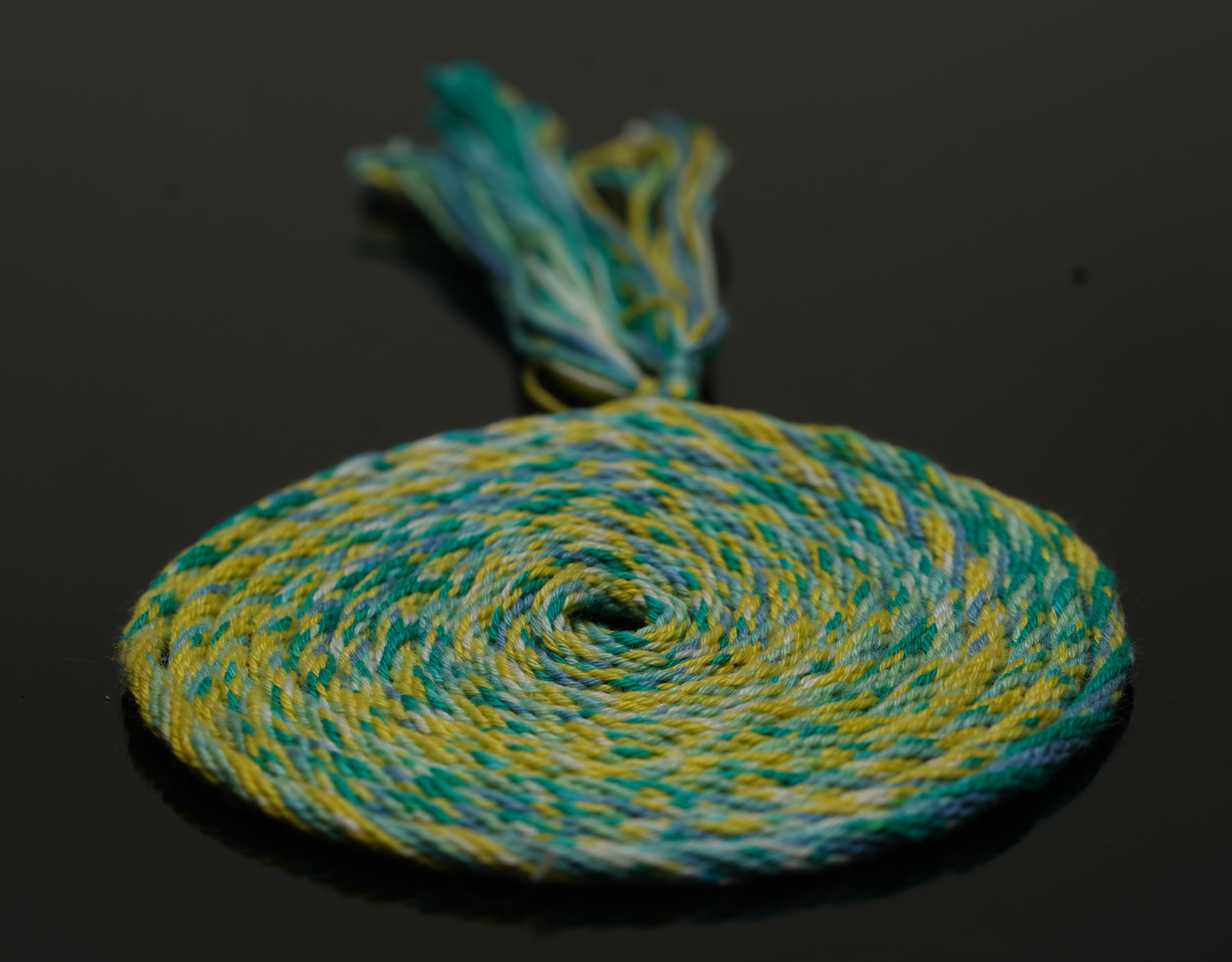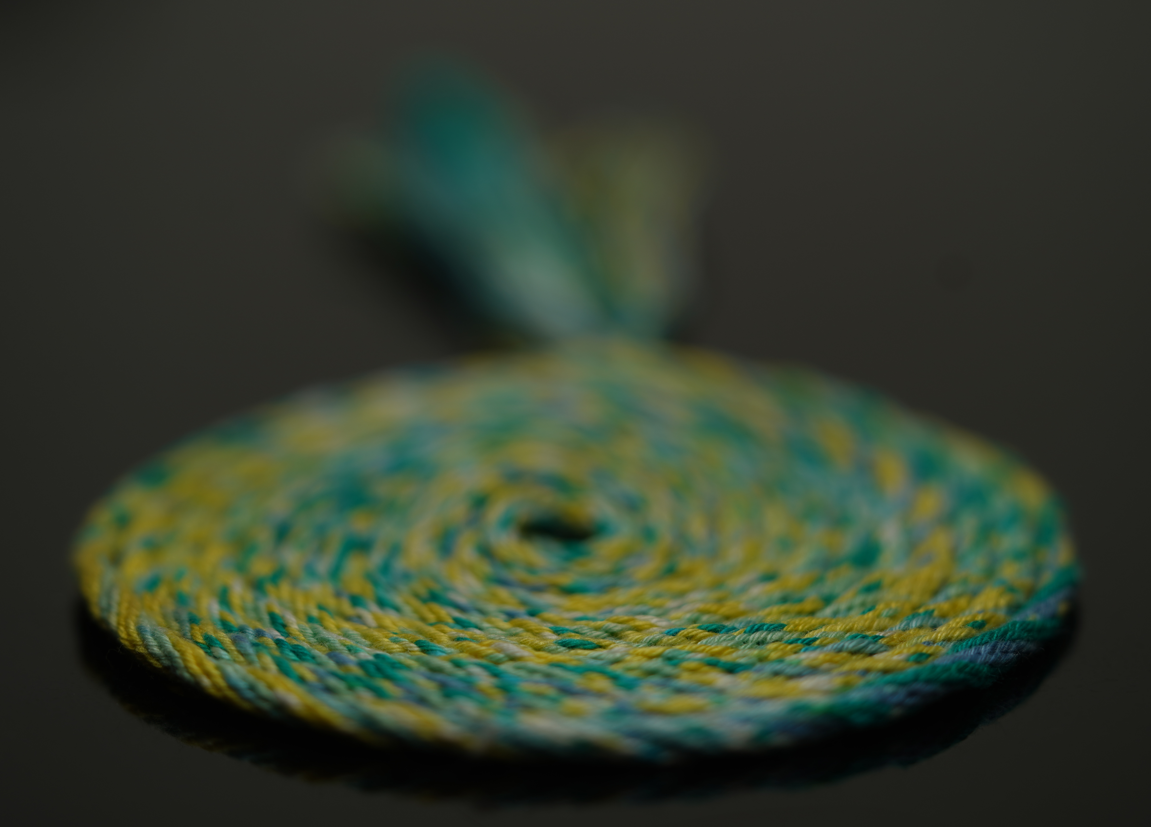 lime, yellow, emerald and aqua braid, sony A7c, sony 90mm macro, godox TT600 flash, 1/2 power?; f/8.0, ev 0, 1/160s, ISO 50, WB: flash; cropped in gimp