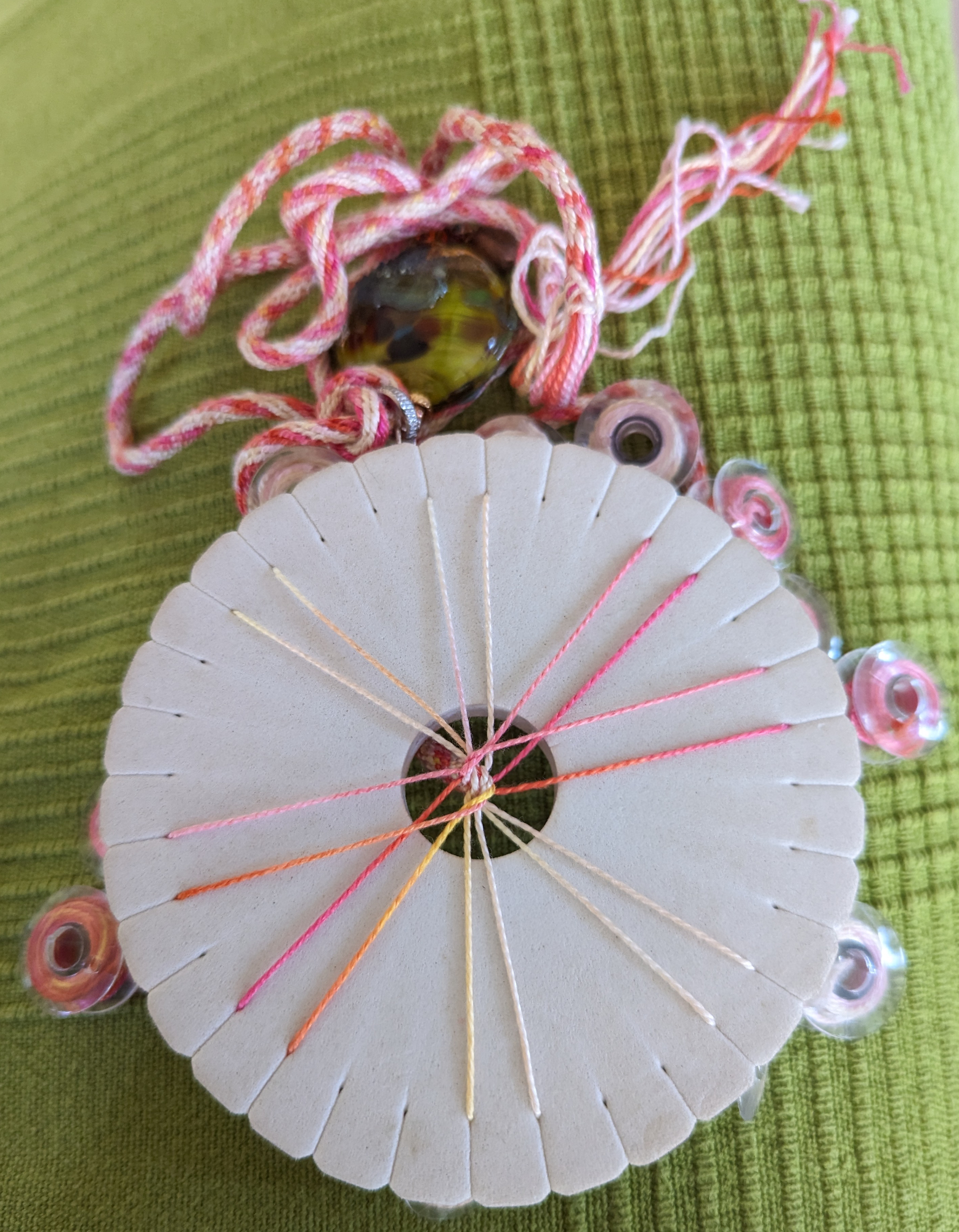 Had to look up kongoh, was originally thinking broken diamonds, except I have no idea how to keiruko no himo on the disk, & had forgotten I only do kongo on disk. Whoops! —Regular diamonds are a pattern that can be done with the kongoh structure, but I didn't set up the colourway for that.