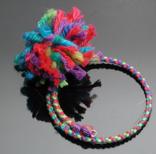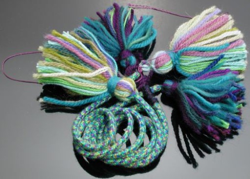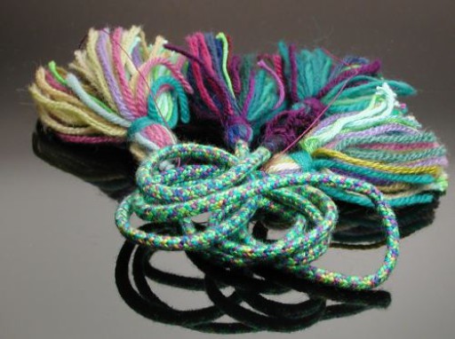 These braids have a wool yarn of yellow, green and cobalt for half the strands. The single ply green-to-blue ombre used in the two of the tassels is beautiful, but shreds apart on the marudai. Again I've used some of the crewel wool scraps to make the tassels, especially the lighter ones. Good as my camera is, alas, some of the violets and reds are a bit hot–add in the vagaries of monitors, and this picture can only be said to be a approximation of the true colors.