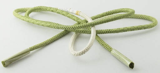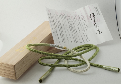 It certainly has a core, because I was able to see it in the interstices of the weaving and with a 10x loupe I could see that the core was some sort of springy material, probably a synthetic, to give the braid resilience (i.e. resistance to kinking after being tied). f2tE told me it is silk, which is the traditional material (though Japanese also weave with a synthetic, called biron), and it is space dyed (i.e. after it was braided), with an ombre shift from the natural ivory color of the silk in the middle of the braid to a celery green towards the ends.