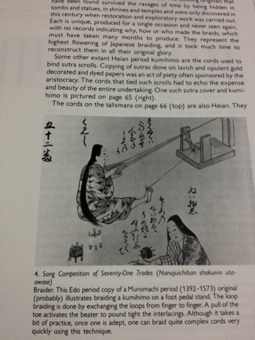 Otousan sent me Exquisite: the world of Japanese Kumihimo braiding and though it has some very beautiful color photographs of braids, to me this was the most fascinating picture in the book, of a woman finger-loop braiding (kute-uchi). I still haven't made much progress, but I'm profoundly grateful that now at least I have the proper resources cued up.