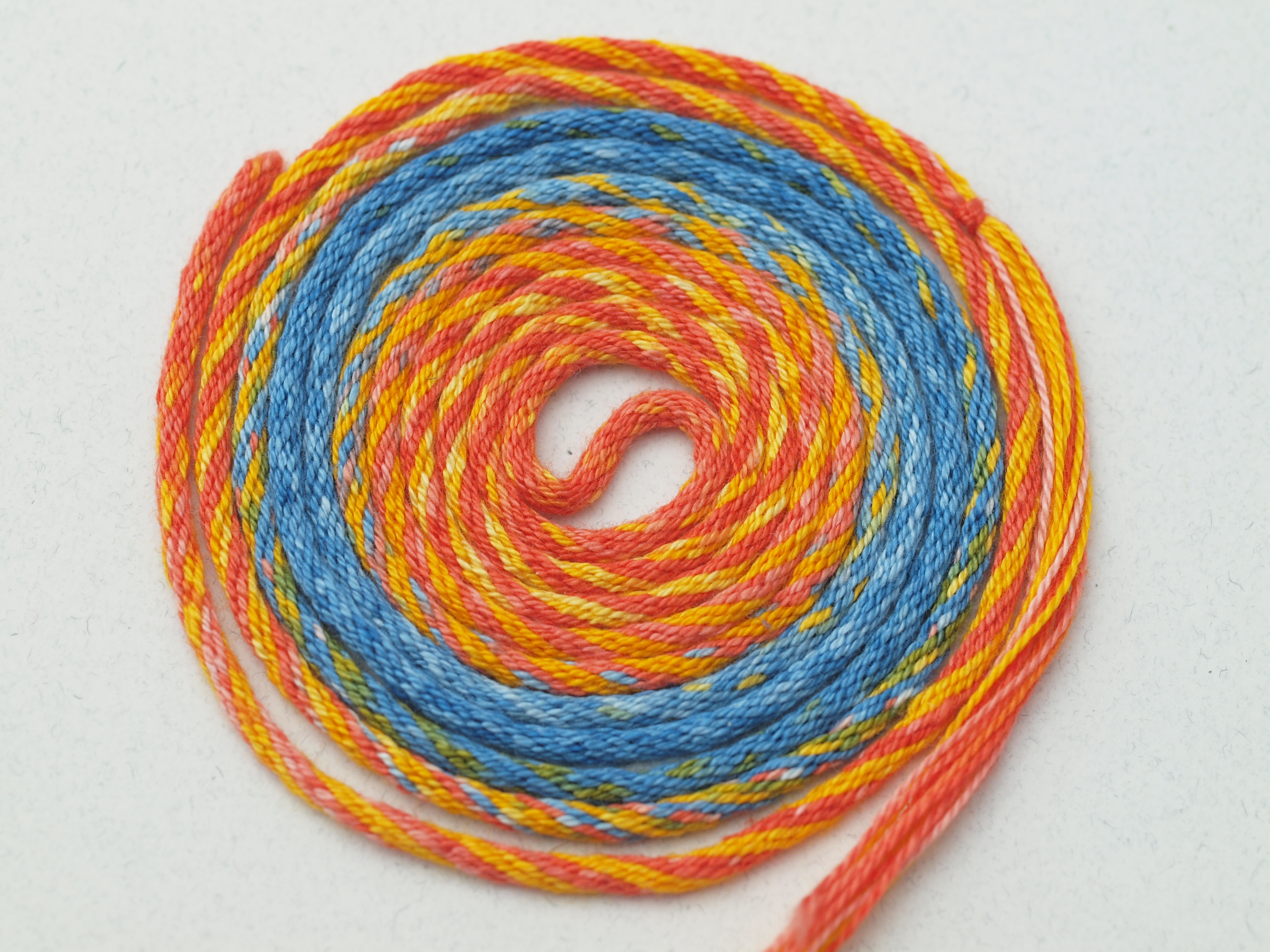 I “crisscrossed” the color: that is, reversed half of them end-to-end to give the yellow and orange contrasting spiralling stripes at the ends of the braid; the shifting colors met in the middle for the pure orange at the center of the spiral, shifting to two blue sections that are basically at the 1/3 and 2/3 mark (i.e. the braid is bilaterally symmetrical in pattern).