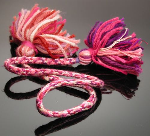 This braid's color shifts were completely unsuccessful, and you can see I shifted from one pattern to another. You can also see it didn't help either. Many of the yarns in the left tassel are samples of wool from a yard sale; the previous owner had evidently put aside one strand, approximately a yard (or meter) long of each color s/he had of crewel. Several of the braids were made with these odds and ends of yarn, most of which are short and unsuitable for traditional knitting or crochet—no doubt the reason my garage saling friend was able to pick up a large under the bed box for such a good price.