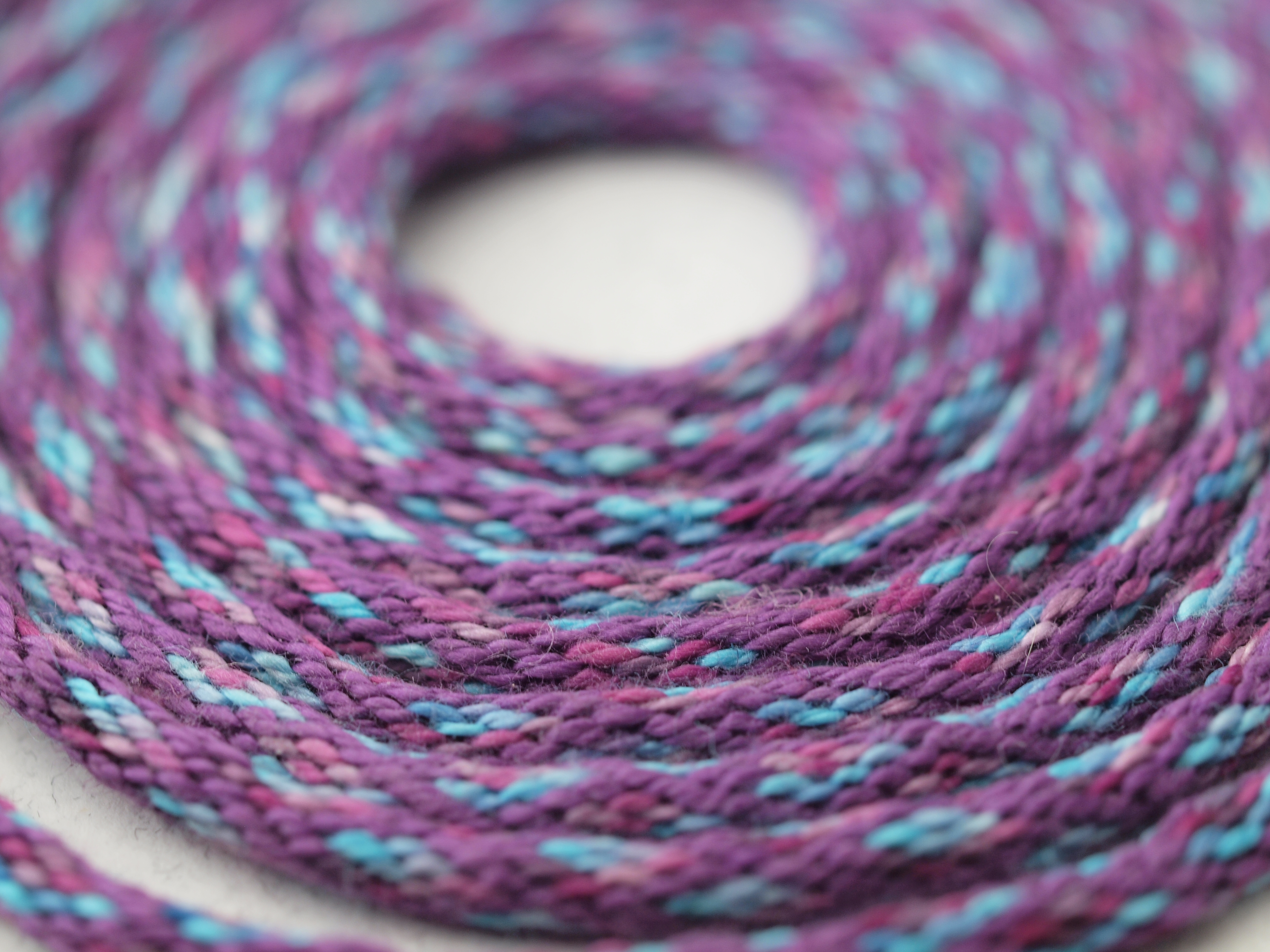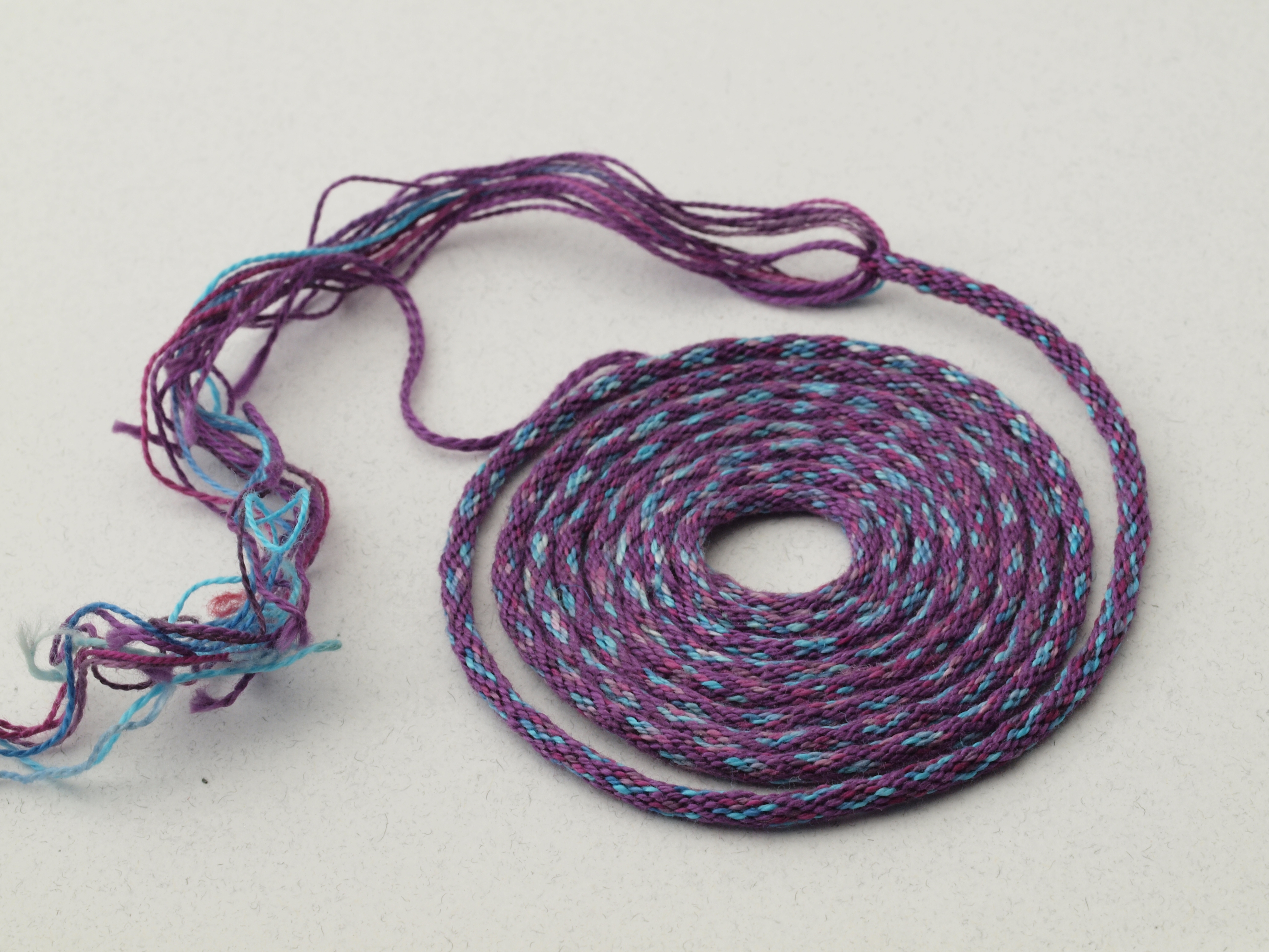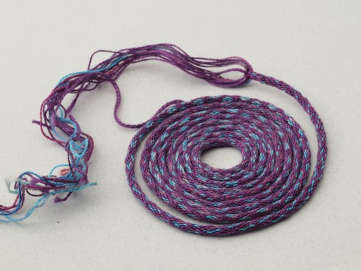 This braid was photographed some time around the end of 2010, and I have no idea where it is; I think I gave it away.[1] To the best of my recollection, it is—perhaps—the second braid I made using a disk. The first was black and white (or ivory) silk. (I think...?) I do, however, have the next two braids I made after it, which I felt were too ugly to photograph. (They're not that awful). I think I was still experimenting with bobbins: I may have used metal sewing machine bobbins as tama for this braid.