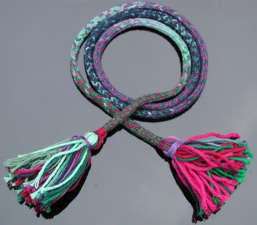 braid of keiriko no himo, 16 strands, ‘Sugar'n’Spice’ brand ombre dyed cotton yarn. Approximately 1/2” (12mm) thick by about 1 yd (1 m) long. Tassels include wool or wool blends.