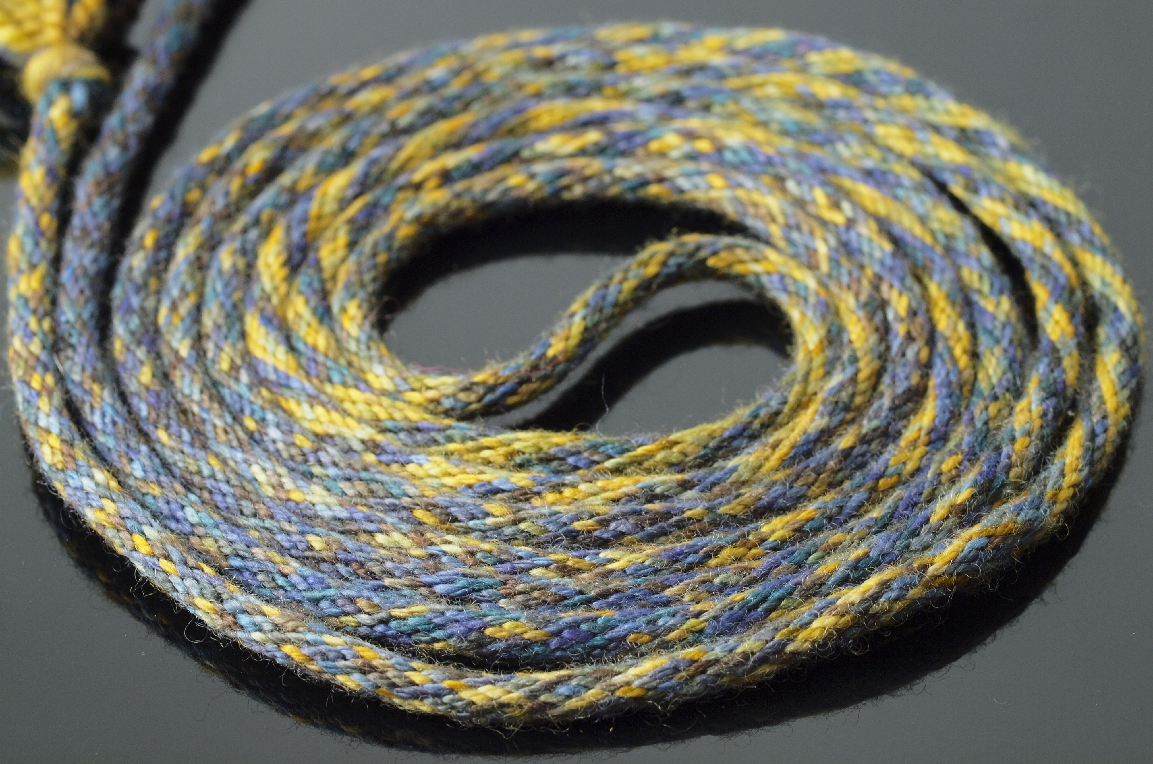 66 inches, 4mm, 16 strands ombre dyed wool, itself a very nice soft double-strand twist. Probably braided in the early 2000s.