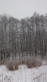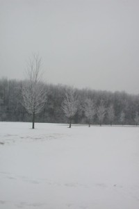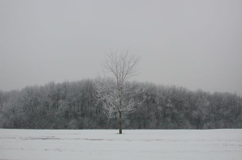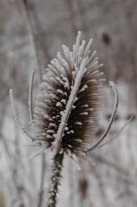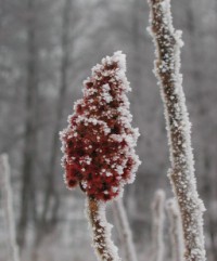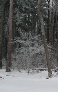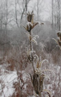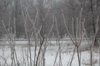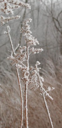 I screwed up and missed the day when the ice crystals were a good 10mm long—the last time these conditions obtained, I hadn't learned to use the macro function on this camera, though I do have a very beautiful shot of a barberry fruit taken with my old, conventional Canon d-70, that I'd like to scan and post some time. Nevertheless, this was the second day of these morning fogs, and I knew I wanted to get pix: the wizard's company has moved to a new location, and that Wednesday was the last day he'd be riding along the Huron River bike path to go to work. The frosty, fairy-like conditions were just a bonus.