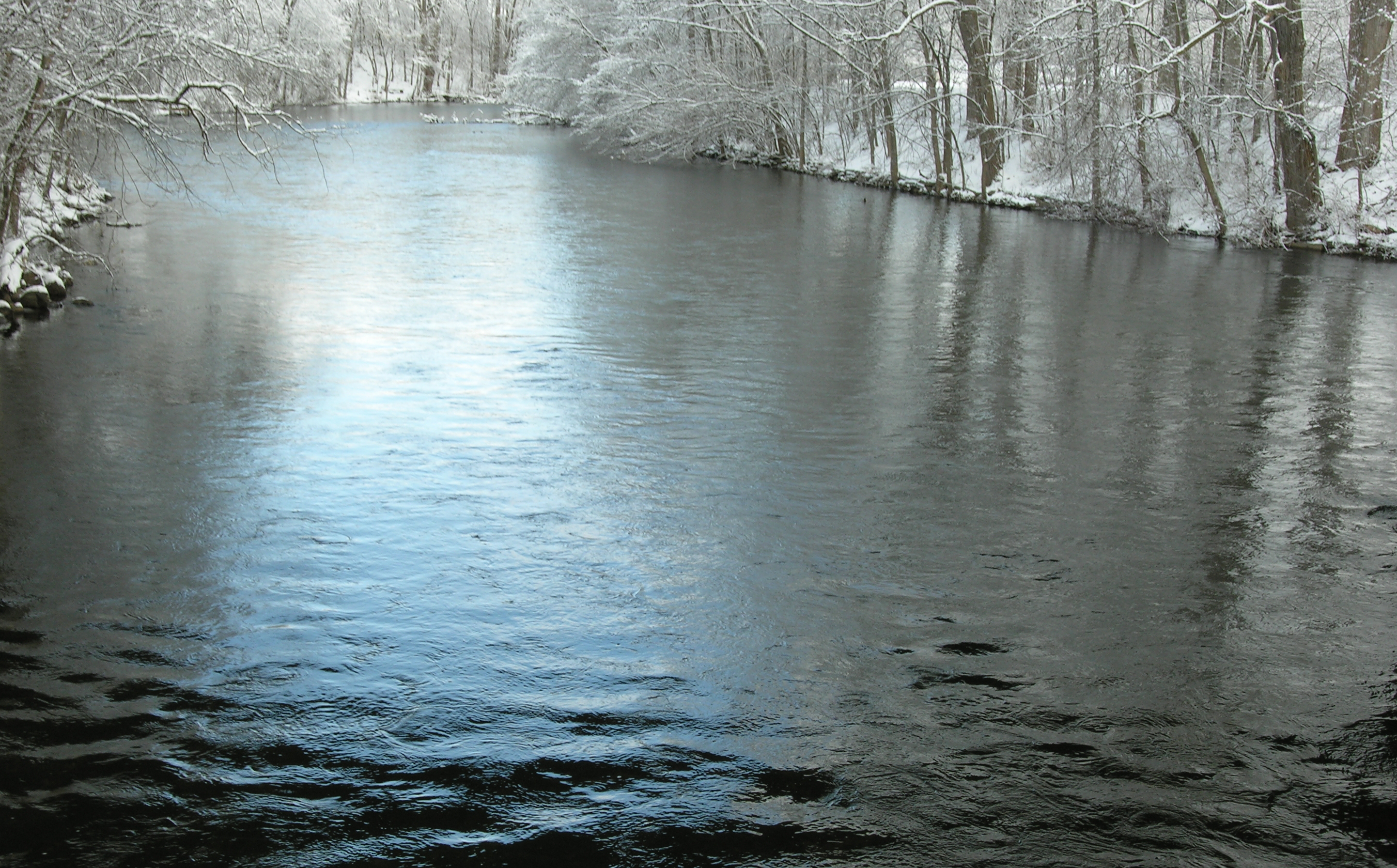 Around about New Year's we got our second big (about 5", which for us is significant but not unusual) snow of the season, and this batch was much wetter than the powder first time around, which meant it stuck beautifully to the trees. As the day progressed the sun became gradually obscured with clouds, leading to this picture, which I shot from the tridge, the local walking bridge with three arms across the river, along side which the snow brightens the patch of brilliant sky blue reflected in the water.