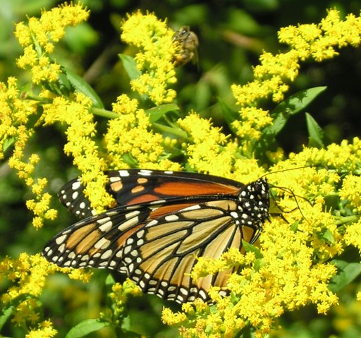Wild honeybees—‘white man's fly’—have pretty much been exterminated by varroa mites, but cultivated hives are hanging on; Maybury state park has a little farm, where they keep bees, and their hives are no doubt responsible for the crittur gracing the upper part of the shot. Needless to say the goldenrod is in full bloom (and so, sigh, is the ragweed—this nearly invisible pollen producer has been responsible for the stuffy noses in my family for the last week and more) and the new england asters are just starting to show in people's gardens.