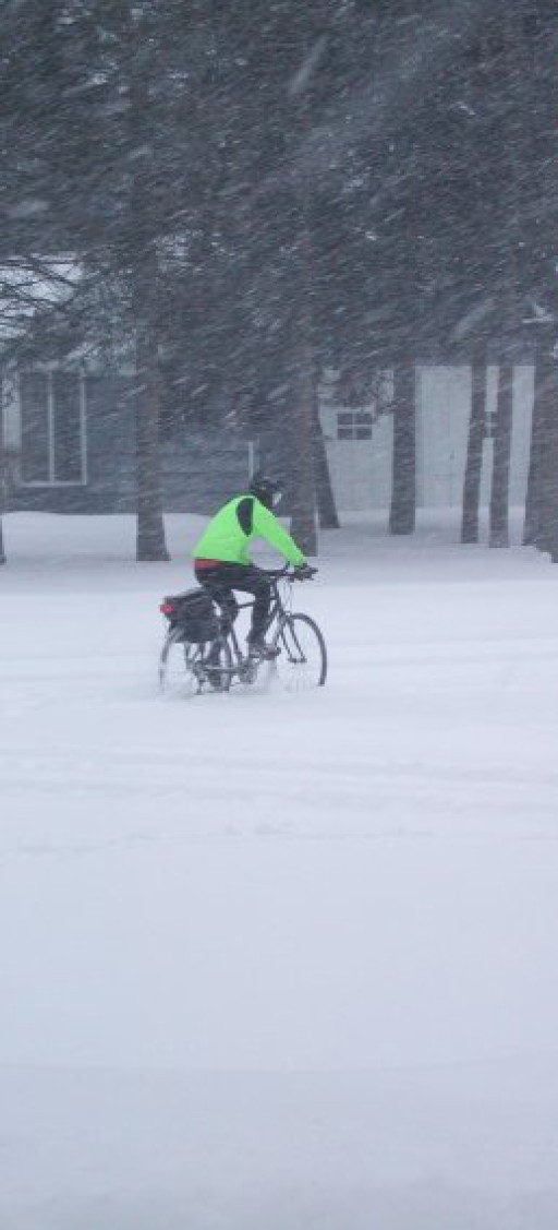 The thing about riding a bike in six inches or more of snow, such as we had today, is getting adequate traction. The tungsten studded bike tires (nokkia if you care) we use are great for dealing with icy patches, but studs don't really stop tires from spinning in all that snow when you push down to get the bike going. I had a lot of difficulty with spinning wheels, and the adage when you're driving in deep snow not to stop for anything is even truer for bikes.