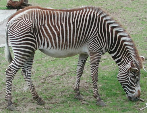 Shot at the Detroit Zoo, in Jun of 2001, which is certainly more local to me than the African savannah...note the little discontinuity to the left of the hip—some foal-hood accident, surgery, what? —where the stripes don't quite match.