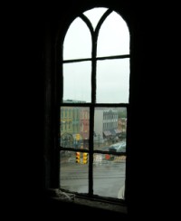 Overlooking the historic part of town. Are those gothic arched windows not fabulous? You just don't see curved muntins like that anymore. The glass is beautiful too, with a bubbles and slight waviness.