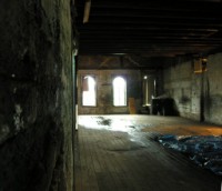 The second floor was unsafe, but we were allowed on the third, where I took this image. Note the dual light sources, one from the window and one from a light, and how the color differs. I also like the way the brick wall to the left goes in and out of focus. This image was rotated a bit, and then cropped.