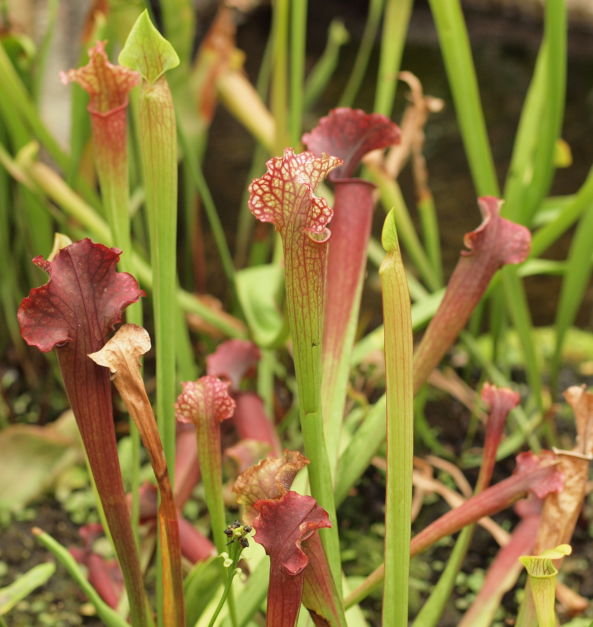 I've always been rather fascinated by carnivorous plants—more for their splendid colors and patterns, I think, than their diet—and the white topped pitcher (Sarracenia leucophylla) are my particular faves (as you might have noticed I use a thumbnail of I photographed years ago as the ‘missing icon’ thumbnail;) Here are some of the better pix I took of these in the Victorian Greenhouse at Frederick Meijer Gardens, which happen to be located in Grand Rapids, MI, on the western side of the state.[1]