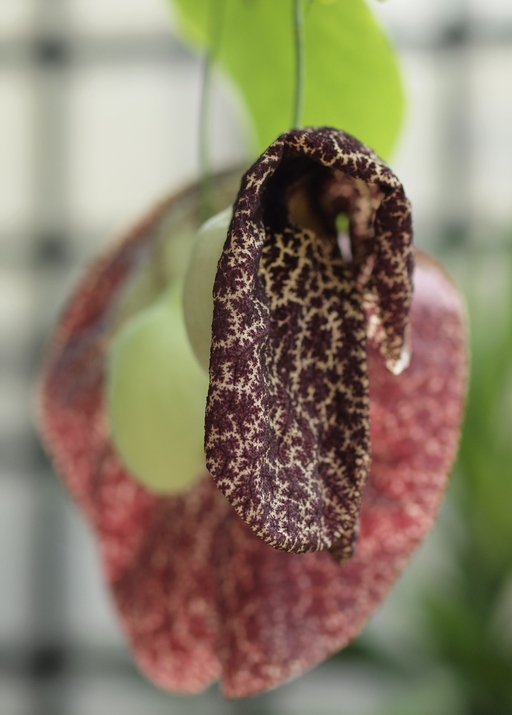 Pelican Flower: Aristolochia grandiflora. Found in Central America & the Caribbean. Reminds me more of a reticulated giraffe, really. (Not sure which of several shots it is, but same equipment & roughly similar settings as others.)